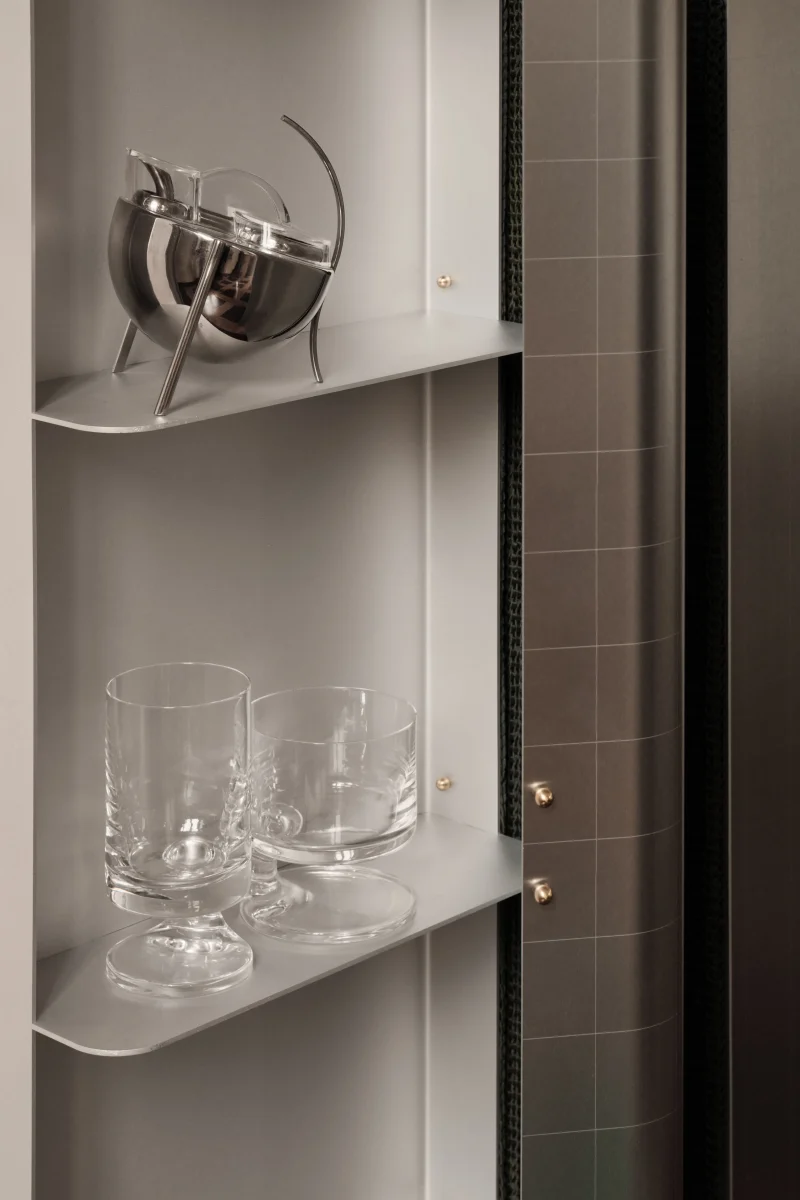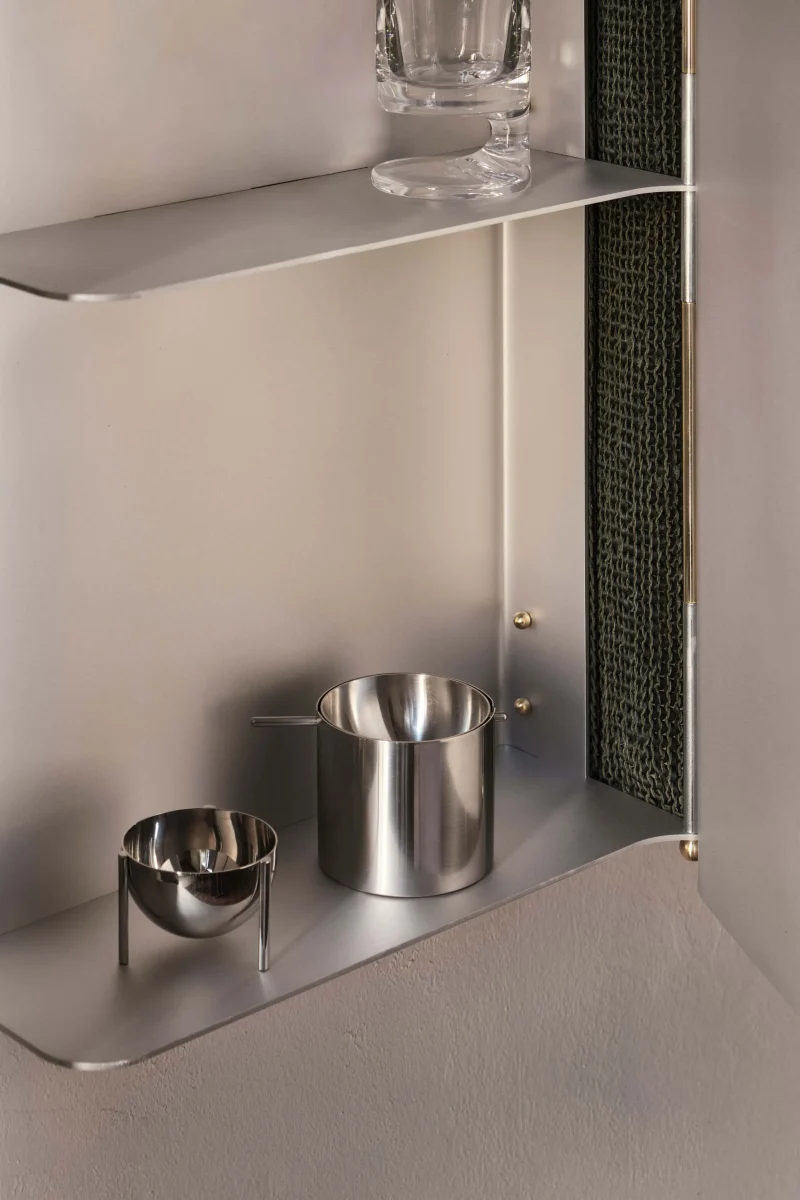 The wall cabinet by Atelier Nuanda, made of natural, light and reflective aluminium sheet, is folded and shaped into a modular element. Its shape allows it to be developed and installed transversally, thus decorating walls and composing new sinuous storage. Enriching and decorating the cabinet is the leather weave of the atelier’s workmanship, characterised by a dense, light and resistant weave that is extremely flexible and elastic in use and hold, which becomes a structural and flexible joint, allowing the door to be opened thanks to a customised hinge system.