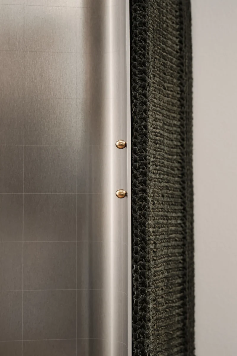 The flexibility of leather and the lightness of aluminium allow a new mechanical and functional detail to be defined in a decorative manner. The geometric motif on the aluminium surface emphasises the sinuosity of the shapes, giving rhythm to the modularity of each panels, enriching it with details and becoming the distinctive signature of the atelier. On the inside, the surface has a contrasting matt finish to emphasise the texture of the leather and the rhythm of the brass spheres that unite the two materials.