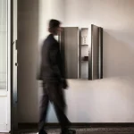 The wall cabinet by Atelier Nuanda, made of natural, light and reflective aluminium sheet, is folded and shaped into a modular element. Its shape allows it to be developed and installed transversally, thus decorating walls and composing new sinuous storage. Enriching and decorating the cabinet is the leather weave of the atelier’s workmanship, characterised by a dense, light and resistant weave that is extremely flexible and elastic in use and hold, which becomes a structural and flexible joint, allowing the door to be opened thanks to a customised hinge system.