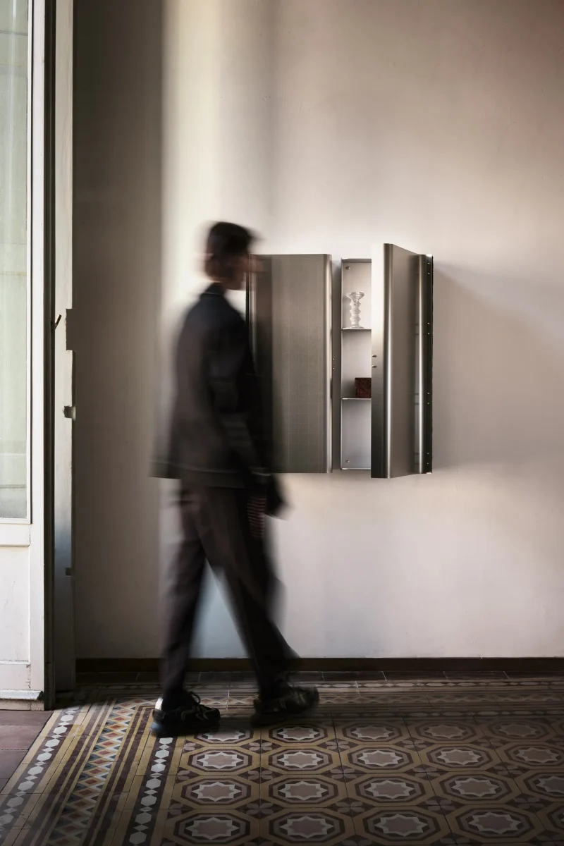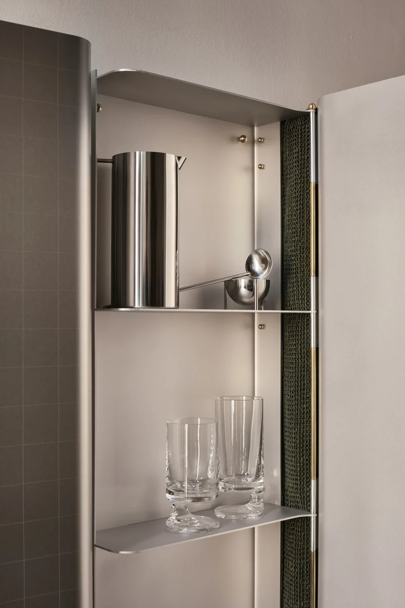 The wall cabinet by Atelier Nuanda, made of natural, light and reflective aluminium sheet, is folded and shaped into a modular element. Its shape allows it to be developed and installed transversally, thus decorating walls and composing new sinuous storage. Enriching and decorating the cabinet is the leather weave of the atelier’s workmanship, characterised by a dense, light and resistant weave that is extremely flexible and elastic in use and hold, which becomes a structural and flexible joint, allowing the door to be opened thanks to a customised hinge system.