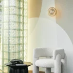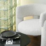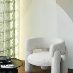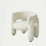 This armchair combines minimalist design with a bold emphasis on voluminous legs, creating a striking balance of form and function. The natural wood supports complement the chair’s overall aesthetic and can be customized to match the upholstery color or stand out with a contrasting hue.