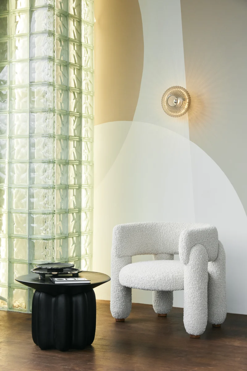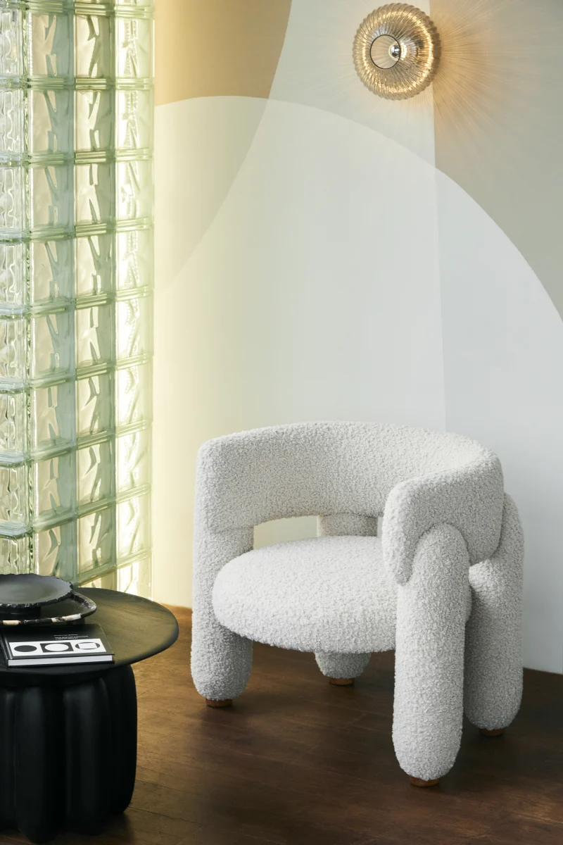 This armchair combines minimalist design with a bold emphasis on voluminous legs, creating a striking balance of form and function. The natural wood supports complement the chair’s overall aesthetic and can be customized to match the upholstery color or stand out with a contrasting hue.