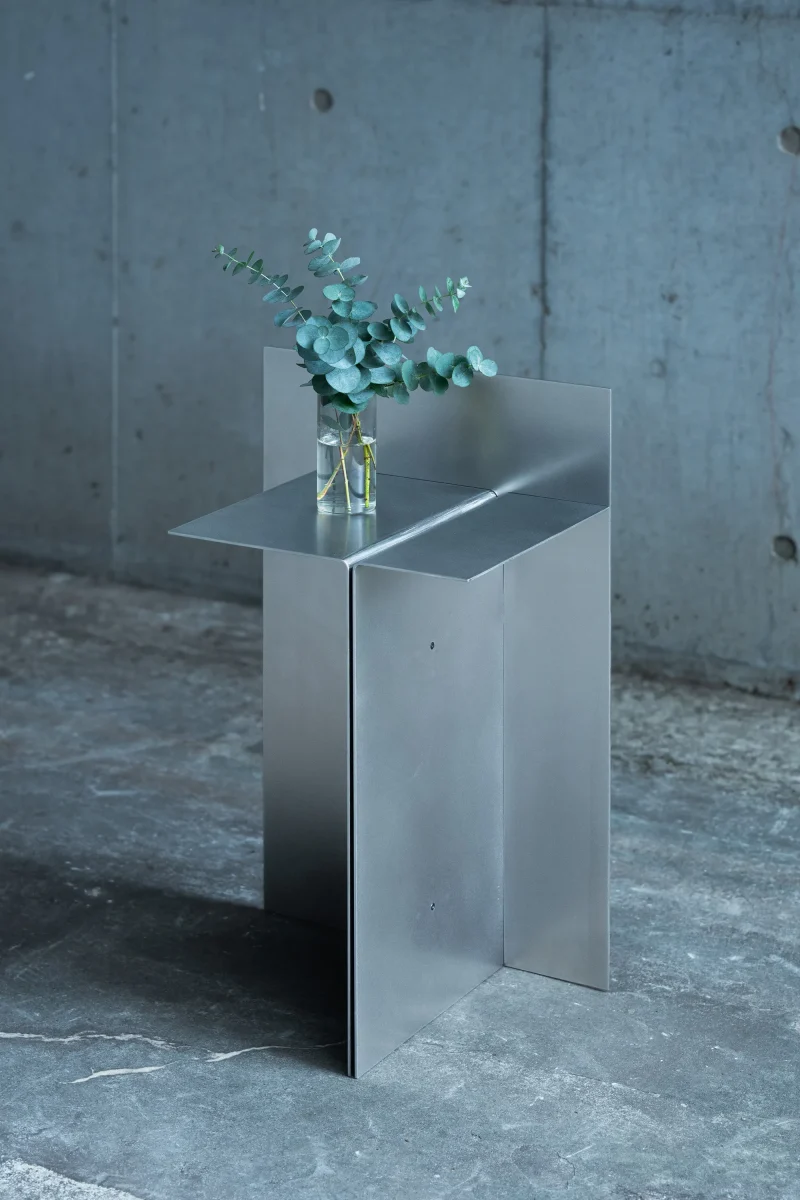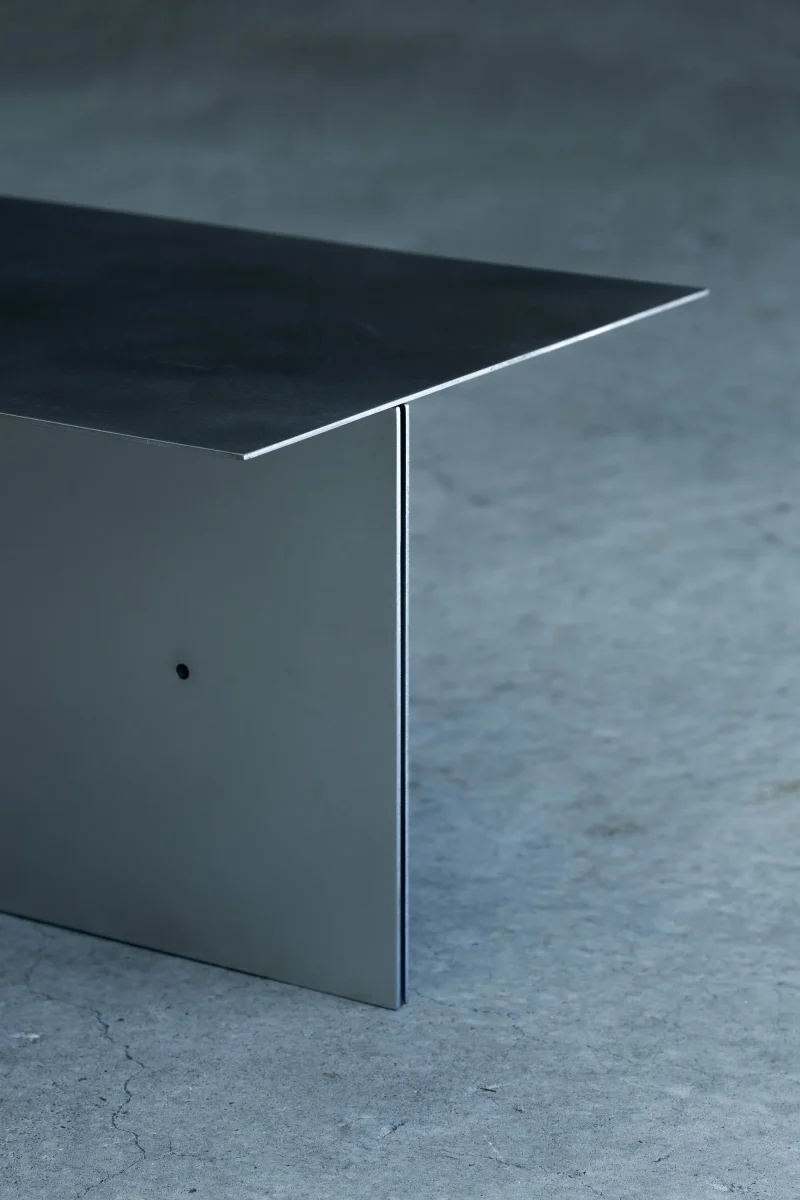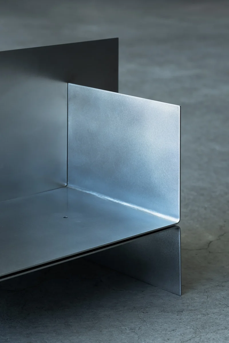This piece has a minimalist construction with only three metal plates bolted together.