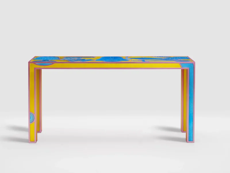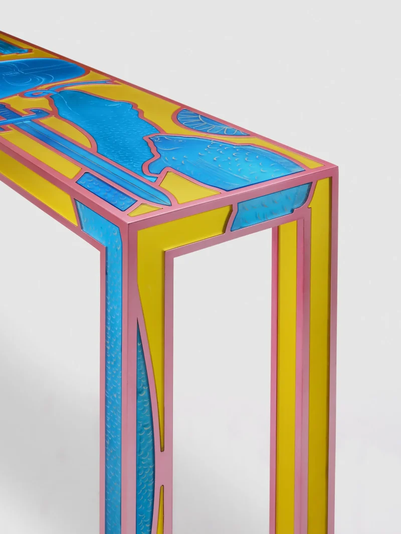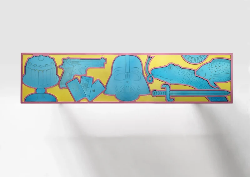 Through symbolic elements that the artist creates through the art of mirror engraving, it is possible to transform the flow of thoughts that accompanies everyday life into reflective material, freezing them and making them tangible in this work with a pop vein, a poetic code of the designer.