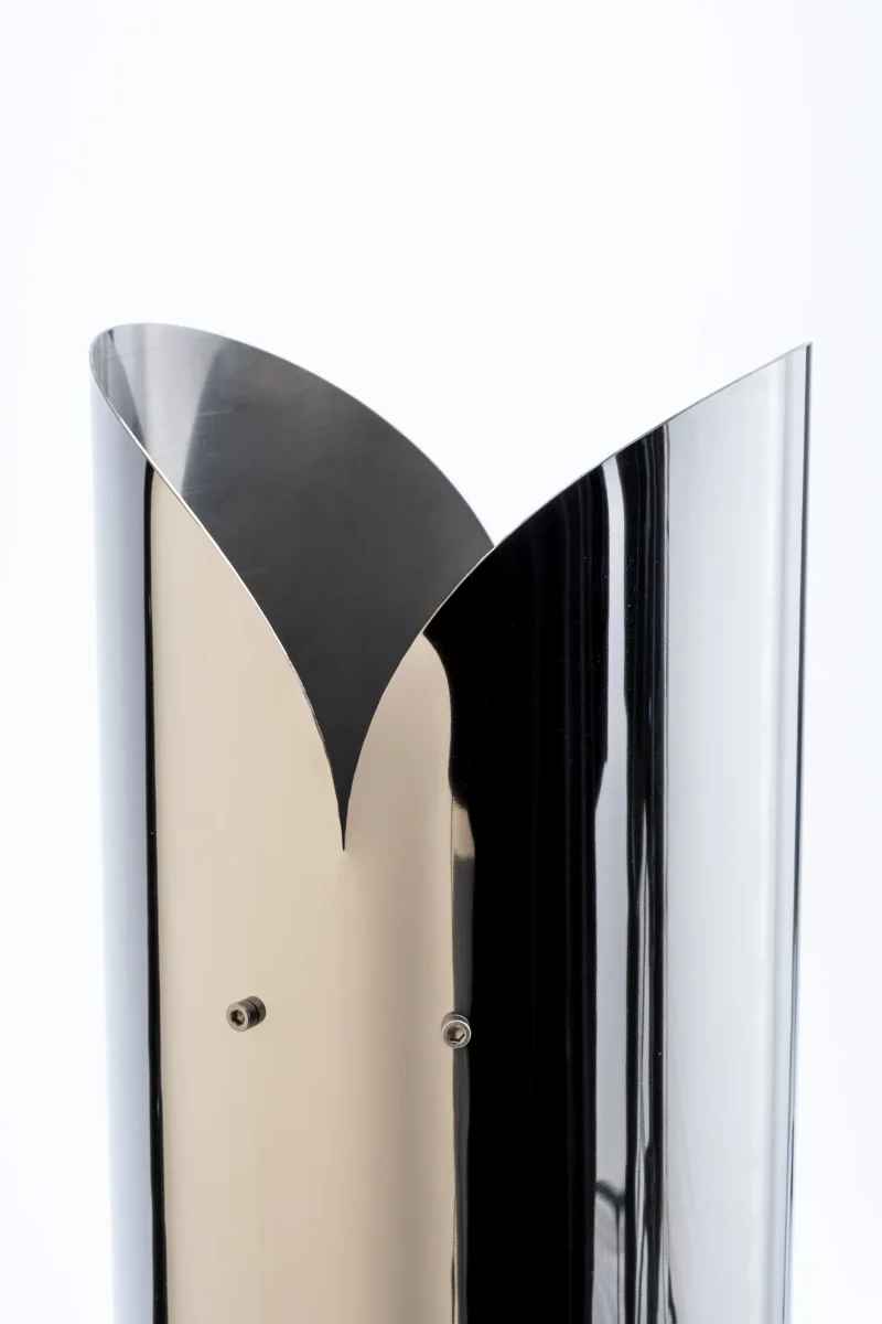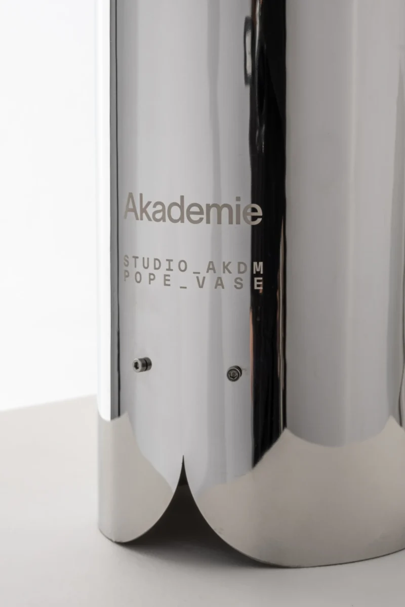 Pope Vase responds to its surroundings by distorting reflections in a vertical manner. Following similar playful forms as the whole collection, it can be crowned with flowers of your choice or simply exist as a sculptural element. Hand-formed by local artisans in Istanbul, Pope Vase represents a contrast between hard material and soft forms as a statement. The name comes from its similarity to a pope hat as its form, which is a great example of the playful tone of Akademie.