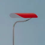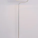 Poser floor lamp balances industrial construction with a playful sense of movement. Its posture comes from a bent polished stainless steel tube, secured to a polished stainless steel base plate, that seems to stop mid-trajectory. This bent form gives the lamp its characteristic lean.