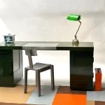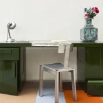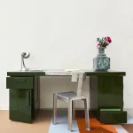 This incredibly desirable version features a dark green color that has been chosen as a new addition to the Practice color palette, transcending a feeling of greatness and humble luxury in his own natural ways. The inside of the cabinets and drawers are finished of in a the known pale green finish from Studio Fabius Clovis. This particular version, detailed of with a hand-hammered metal desk pad and a ‘floating’ drawer underneath the desktop enriches any room, space, building, universe and beyond.