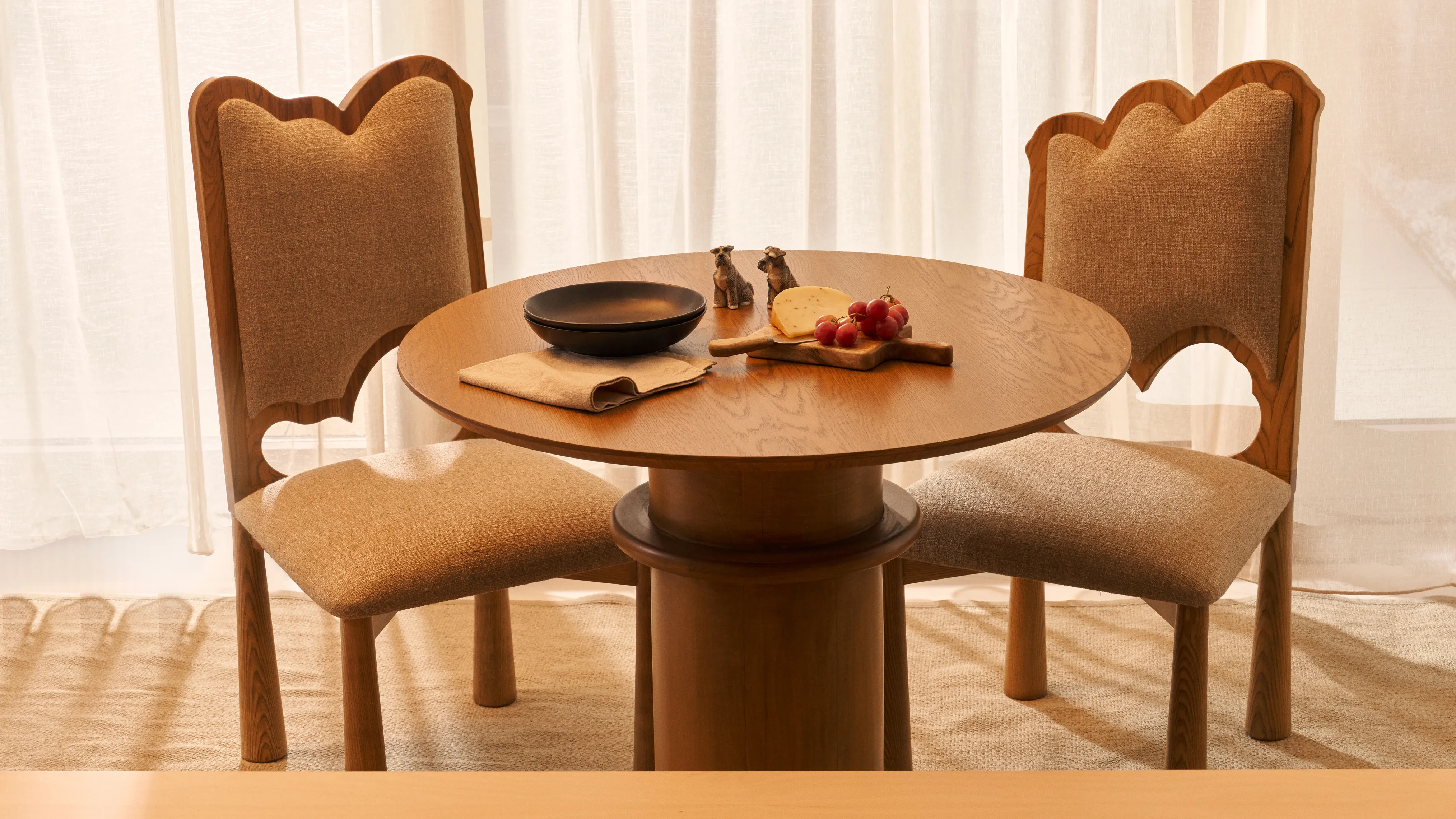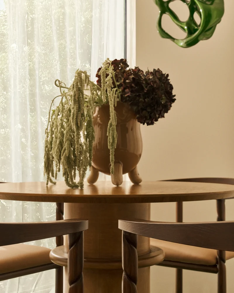 Our oak dining table is a small-scale statement for kitchens and cosy corners, with a smooth round top balanced on a bold, sculptural pedestal base. Crafted entirely from solid oak, it shows off a warm, natural grain that pairs beautifully with both classic and more playful chairs. The proportions feel intimate yet generous enough for shared plates, late breakfasts and long, easy dinners – a simple, grounded piece that quietly becomes the heart of the room.