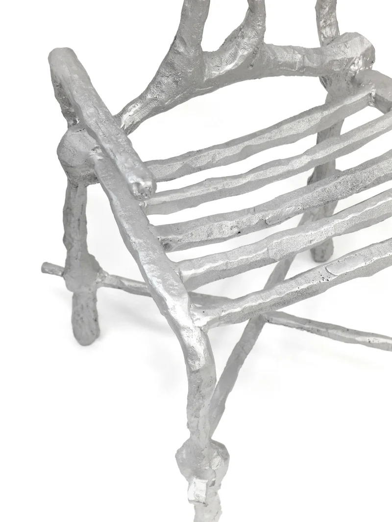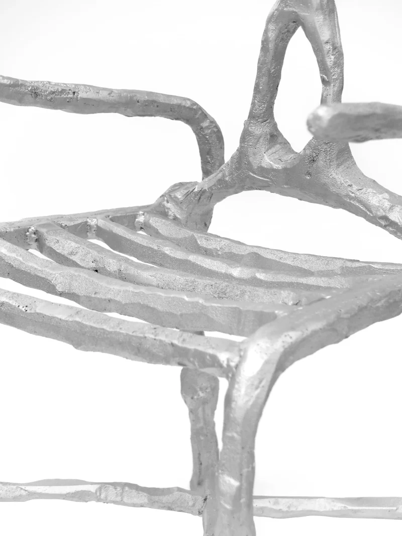 An exploration in lost foam casting, Primal Chair by Matan Fadida is a sculptural piece that foregrounds materiality. Initially carved from foam, the chair was taken to a local foundry in London to be cast in aluminum. The details retain the cuts and movements made during the initial carving process, preserving evidence of how the chair was crafted. Named Primal due to its simplicity and honest use of materials, the chair was originally conceived to represent the ‘skeleton’ of a chair.