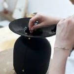 As you move around the object, you will see the different geometries traced by the threads in relation to the initial arrangement of the grips. The objects are available in different colours that combine glossy and matte finishes in contrast with each other.