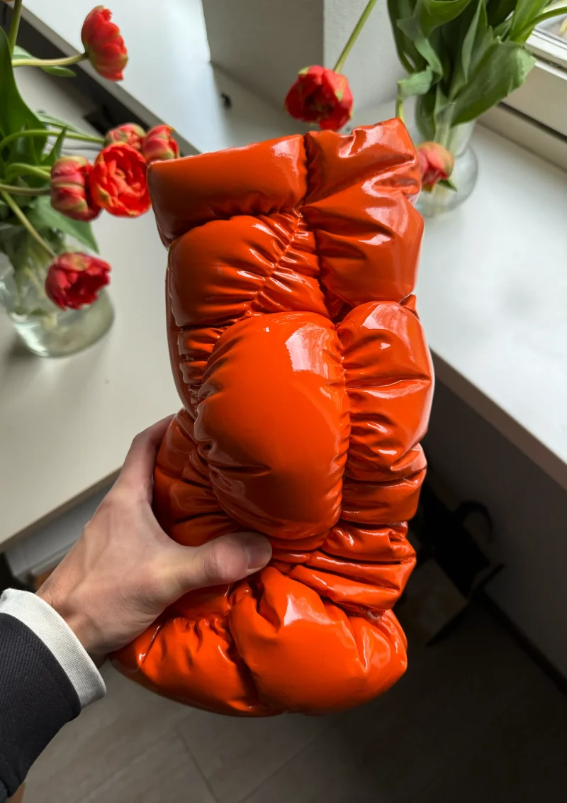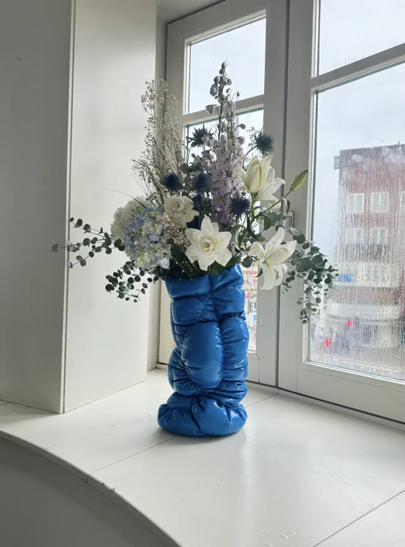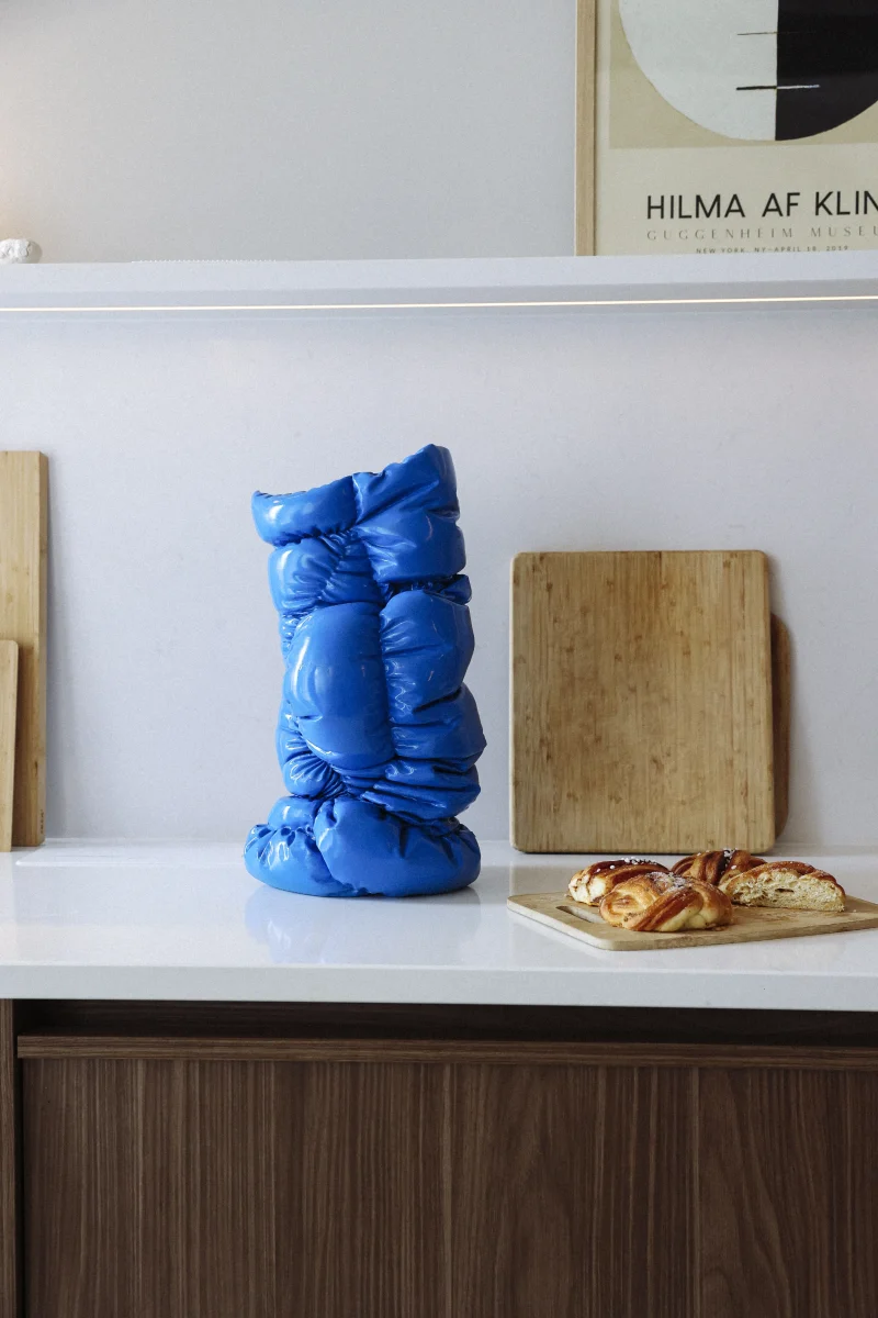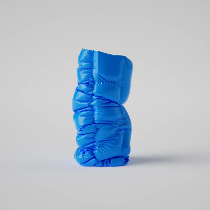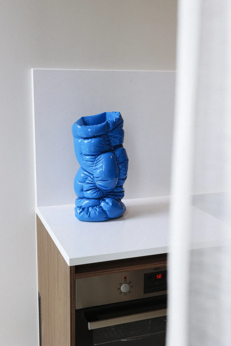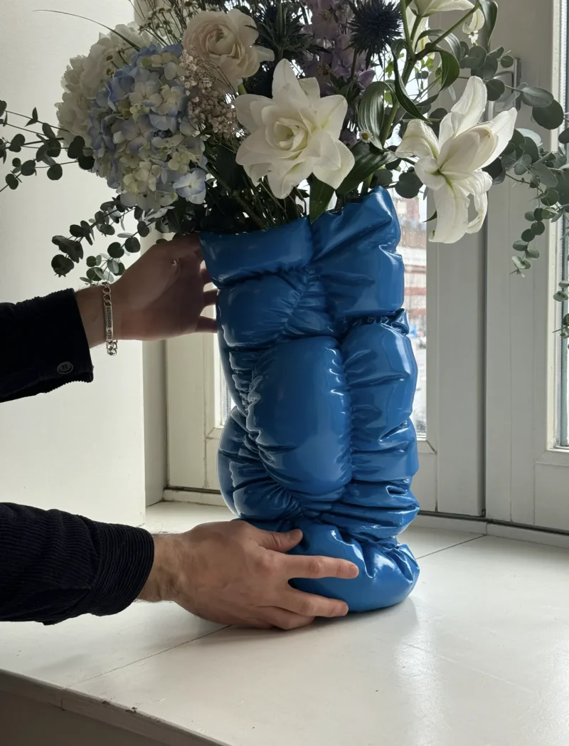 The Puffer Vase by Gast Studio is a striking fusion of digital innovation and analog design, embodying a sophisticated interplay of craftsmanship, technology, and creativity. Crafted from durable ABS plastic, each vase undergoes a meticulous process, being plastic-coated with premium paint and finished with a high-gloss varnish, resulting in a robust and lustrous appearance. The design evokes everyday items like bubble wrap or inflatable armbands, with its inflated structures obscuring their functionality at first glance while radiating an unexpected lightness.