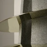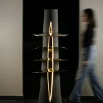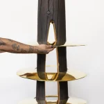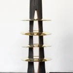 This lamp is crafted from volcanic stone, with the discs made from recycled bronze. There is also an option to create it in wood, specifically white oak, charred using a renowned Japanese technique.