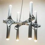 Quetschi by Thomas Waidhofer is a work series of lamps and furniture based on a crimped cross connection of 50mm aluminum tubes. Mostly, the joints are necessary to create stability or shapes, but they can also be introduced just as a style element. The crimped surfaces are made with a custom-built workshop press. The squeezing creates strong forces in the material, sometimes leading to cracks and fractures, but these are considered imperfections. When used as a lamp, the wiring is visible on the outside, which is meant to be a statement against the flawlessness of modern lighting design, which always means less lamp and more light.