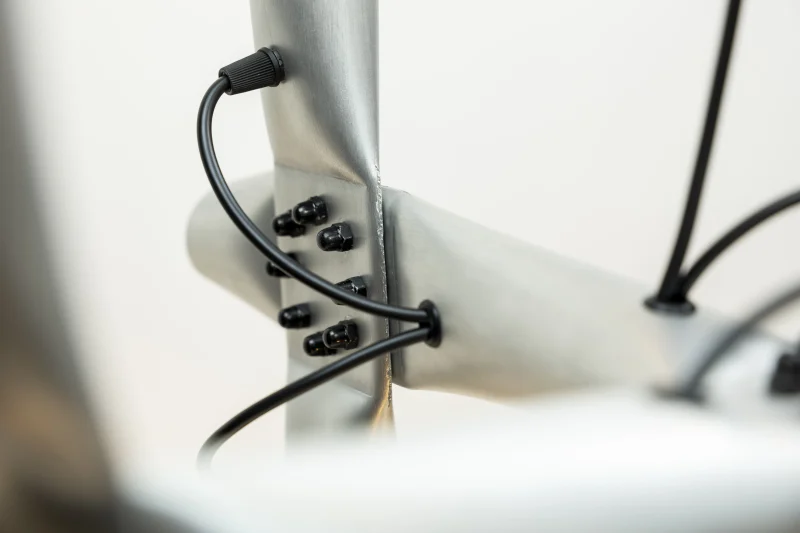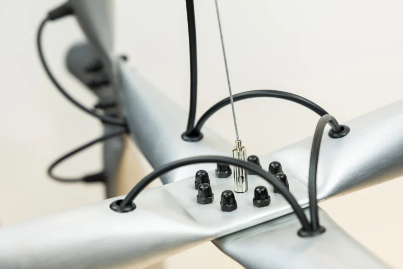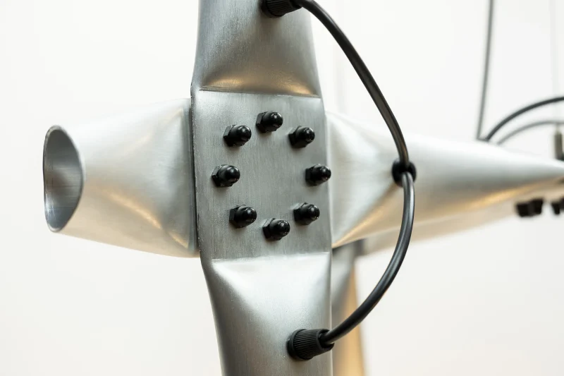 Quetschi by Thomas Waidhofer is a work series of lamps and furniture based on a crimped cross connection of 50mm aluminum tubes. Mostly, the joints are necessary to create stability or shapes, but they can also be introduced just as a style element. The crimped surfaces are made with a custom-built workshop press. The squeezing creates strong forces in the material, sometimes leading to cracks and fractures, but these are considered imperfections. When used as a lamp, the wiring is visible on the outside, which is meant to be a statement against the flawlessness of modern lighting design, which always means less lamp and more light.
