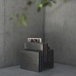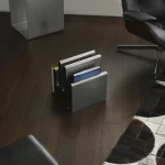 The R001-01 stainless steel magazine holder by Julian Moscoso is the result of an in-depth exploration of geometry and the plastic properties of stainless steel. A single sheet is precisely folded and bent, reshaping it to store magazines and books while also functioning as a sculptural piece. The raw material remains exposed, highlighting its natural shine, reflections, and clean, contemporary look. The holder balances utility with a strong visual presence.
