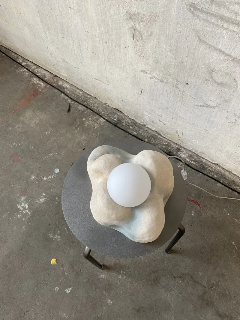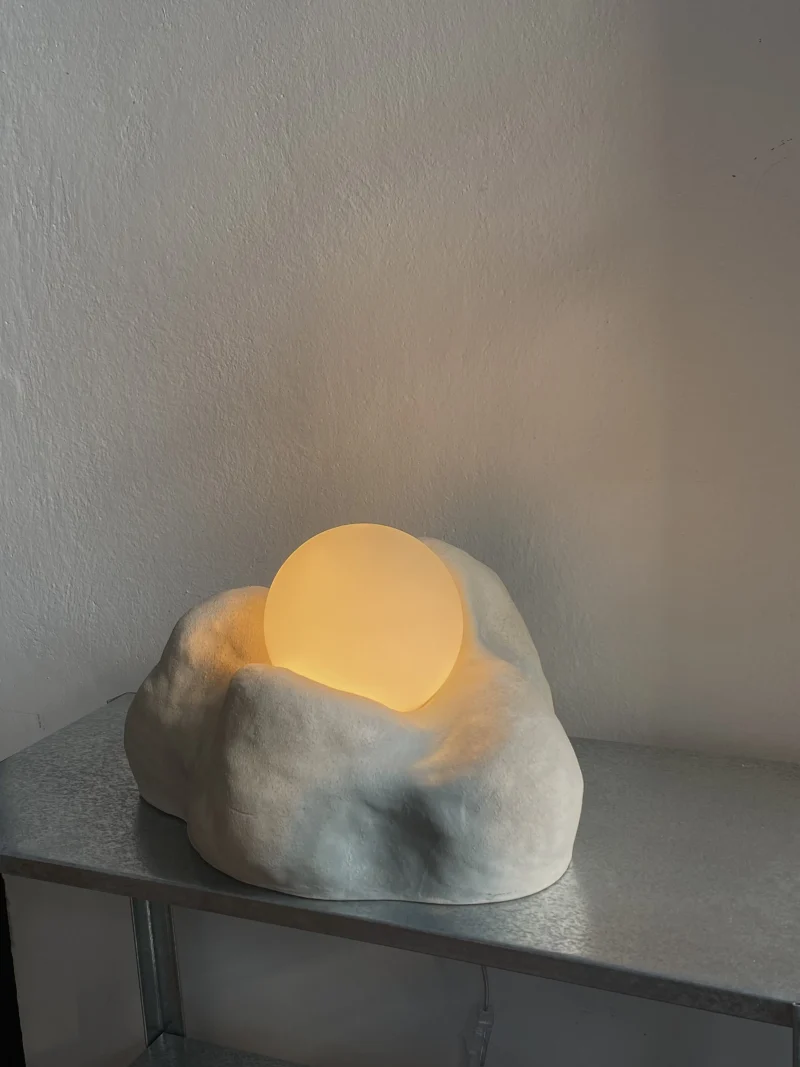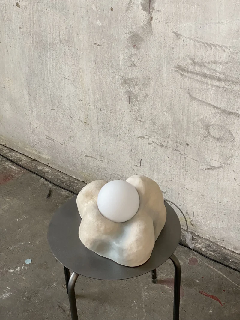This lamp is made of raw, rough ceramics. The light bulb is included and it is a G9 ~200lm 2W warm white (2700K) light bulb. Equipped in European plug. Includes matte glass ball lampshade.