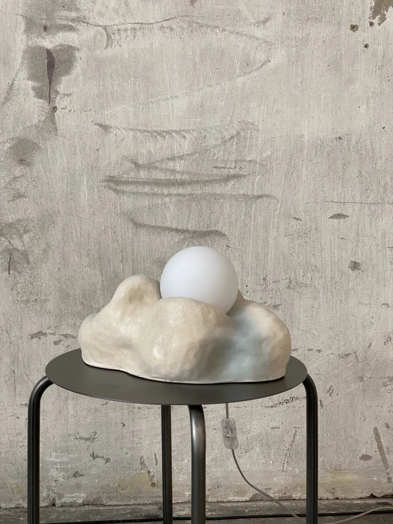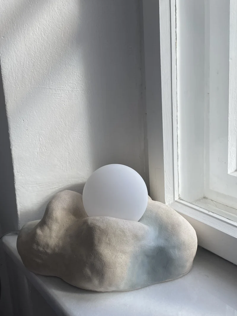 Hand-sculpted and hand-wired ceramic lamp by Raios, based in Poland, skillfully combines simultaneous elements of coastal tranquility and resilient brutalism. Its dune-like shape and engobe blue-gray gradient paint create a natural, organic feel. Emitting a warm, inviting light, it’s perfect for creating cozy atmospheres in any space. Crafted with care and attention to detail, this lamp brings a touch of sculptural beauty. Each object may have imperfections characteristic of handcrafted ceramics, which makes it unique.