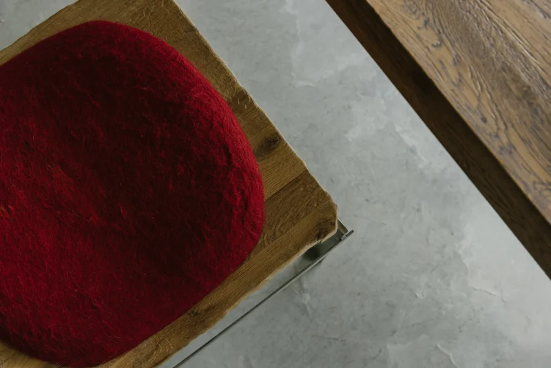 Random is made from crafted felt oak wood and stainless steel, It is available in customizable colors, including blue, red, and terracotta.