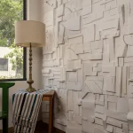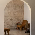 The collage tiles are composed randomly from recycled wood remnants and when installed bathe any space with a warm feeling and texture which is meditative, sanded to a soft finish, and protected with lacquer and wax. The works convey an energized tranquility, a chaotic Brutalism from accidental beginnings.