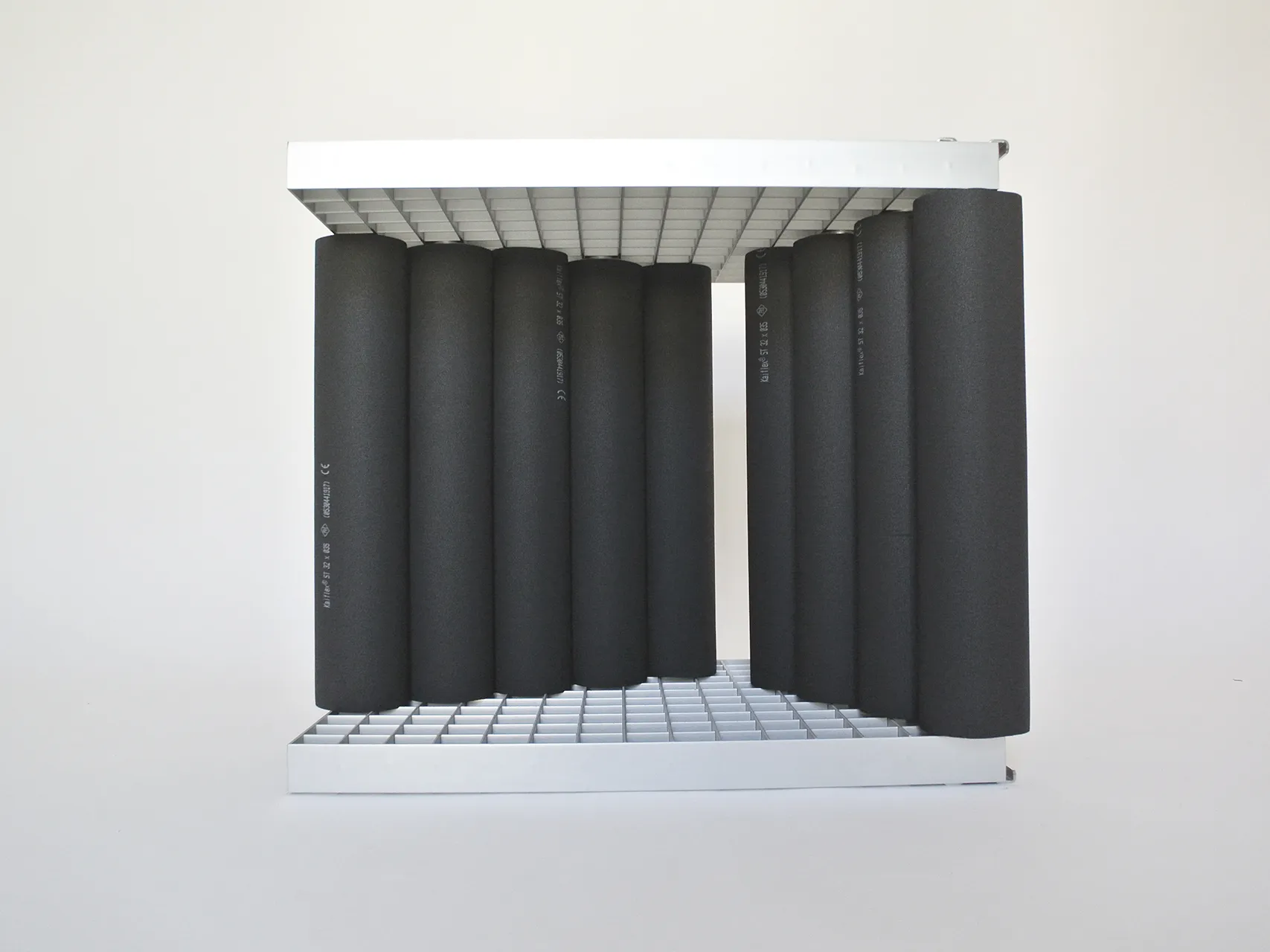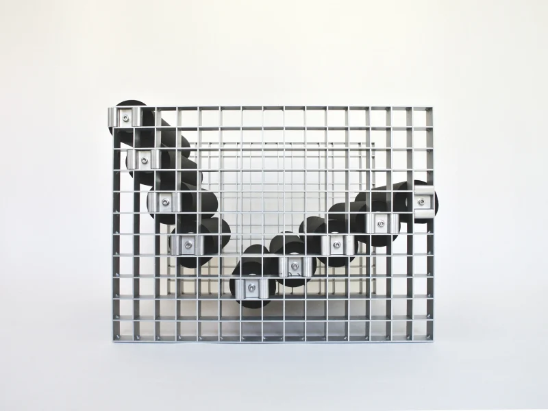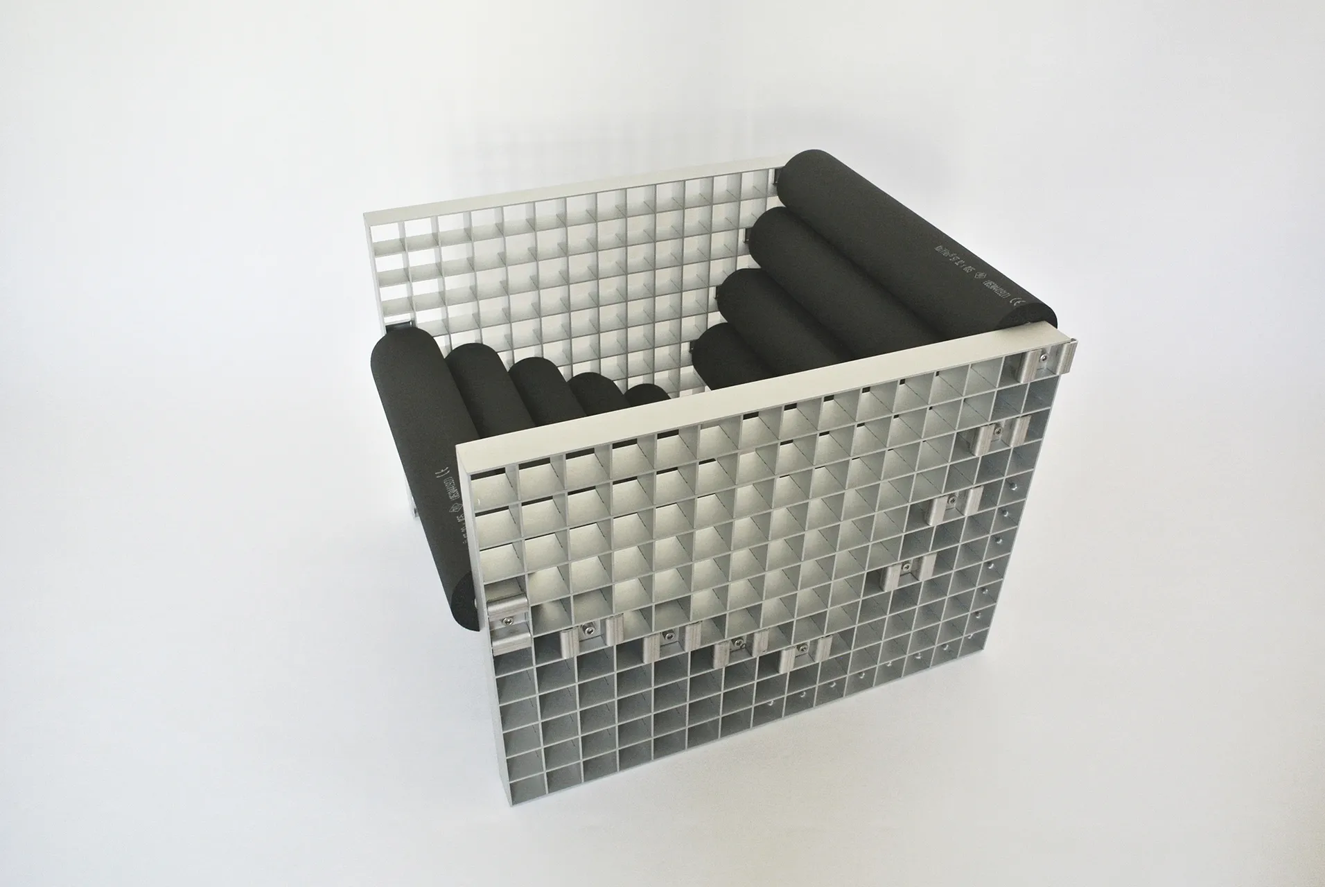 Aluminium grating is the main infrastructure of the Raster chair by Studio Endurance, to generate a range of modular seating furniture for both indoor and outdoor.