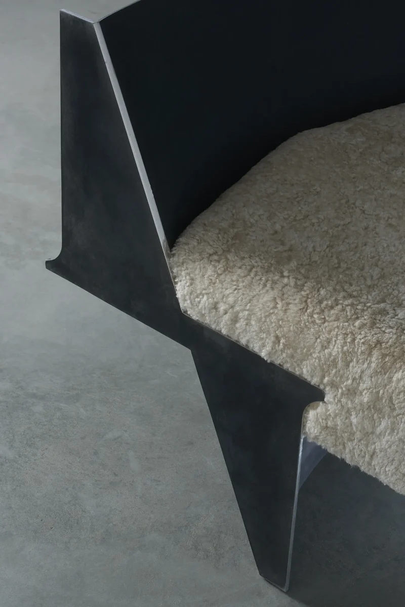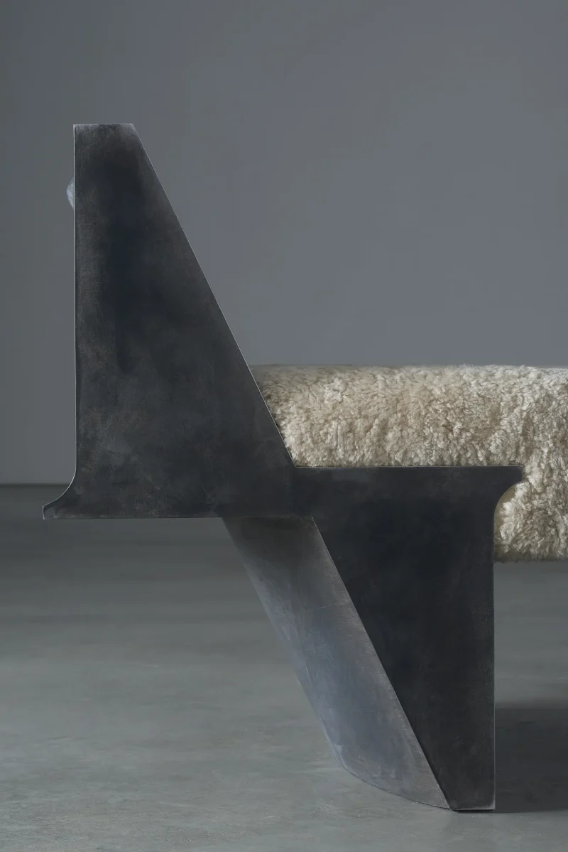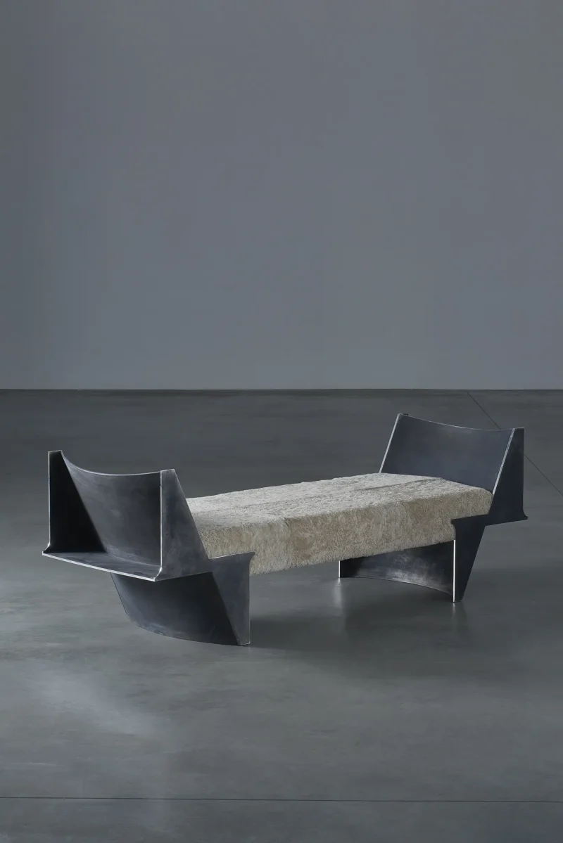 By combining ethically sourced materials such as sheepskin with polished edges of patinated aluminium sheets for “Récamier”, the designer seeks to inspire us to rethink our being and the impermanence of life.