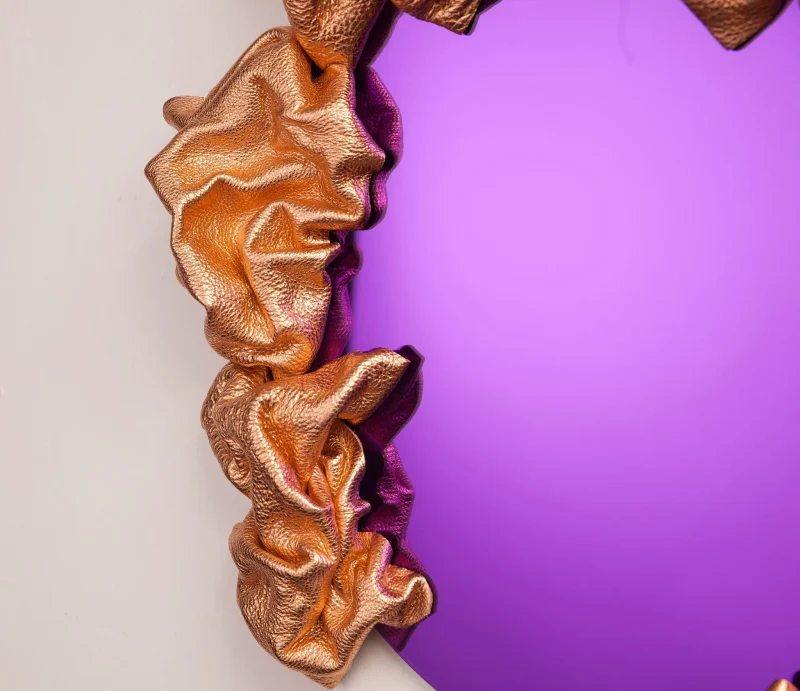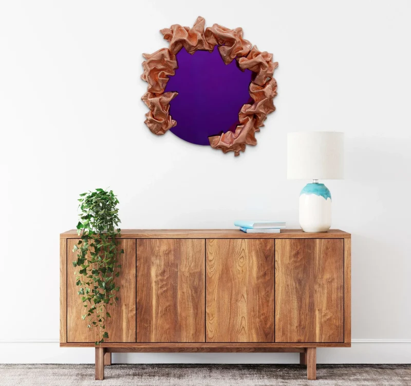 Multidisciplinary artist Ted VanCleave has spent over thirty years crafting his unique visions, residing in San Francisco, Los Angeles, and Miami before settling in Saint Petersburg in 2017. His latest work, the Reflexions Collection of sculptural mirrors, showcases a captivating blend of fluid and organic shapes infused with vibrant colors. The medium is leather, reimagined in extraordinary ways. Each piece serves as a meditation on form, revealing a different narrative from every angle. With their flowing contours, intricate folds, and striking metallic finishes, these mirrors bring a dynamic energy to any space.