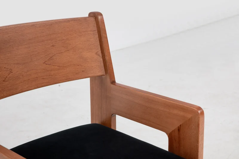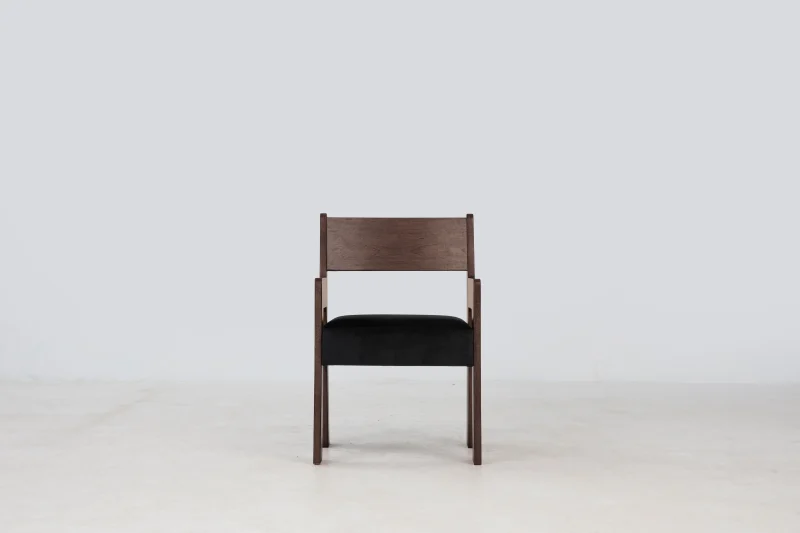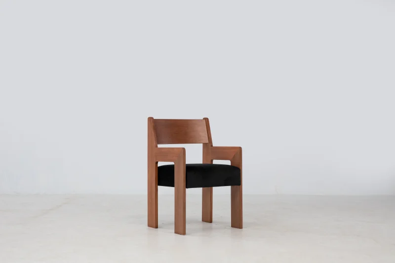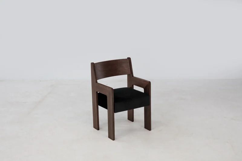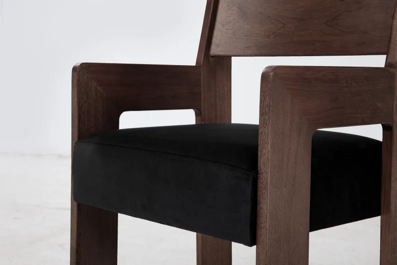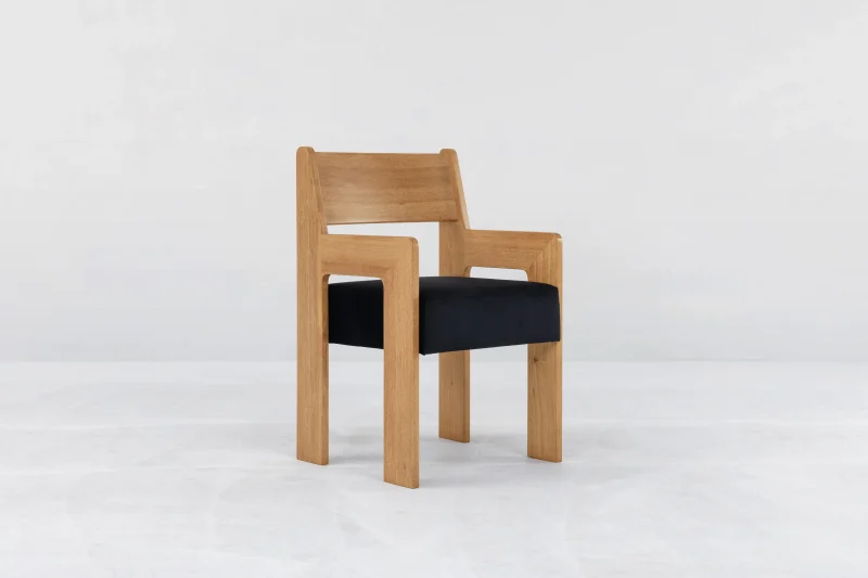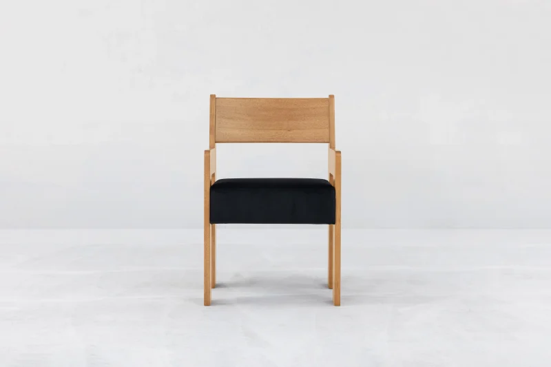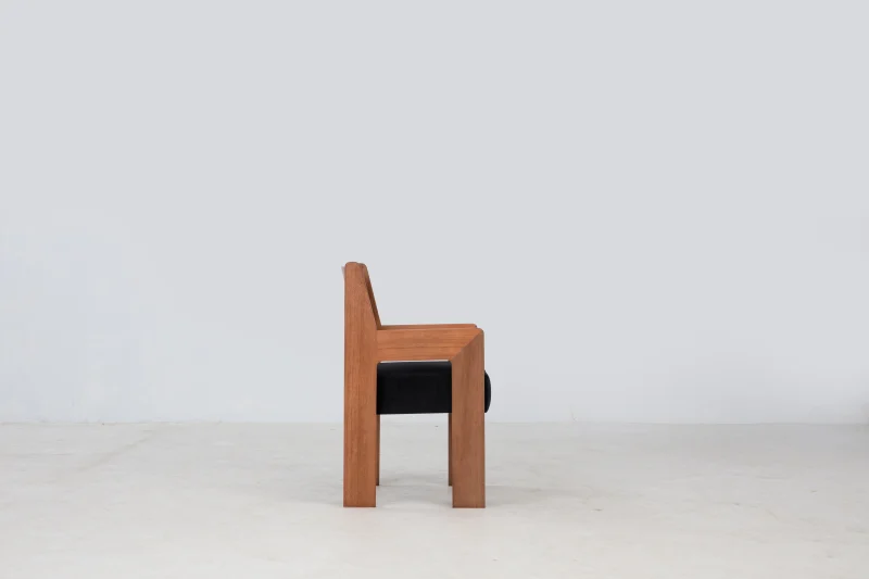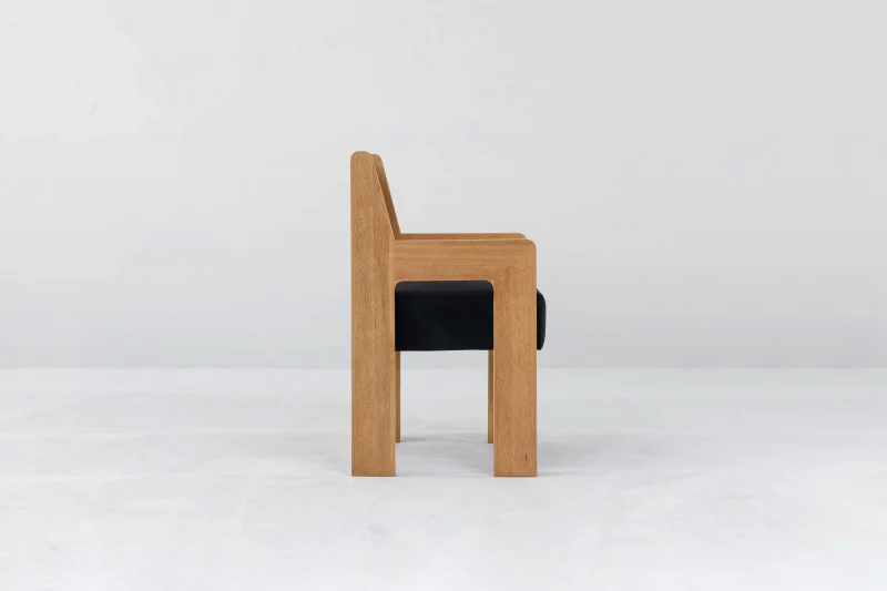 The Reka Armchair by Sun at Six spotlights contrasting widths. In designing the chair, we played with wide and narrow, thick and thin: the legs are wide and flat along one axis, thin along the other, while the seat cushion was elongated and fattened vertically. We designed this chair for comfortable multi-hour sitting sessions and used a slightly wider footprint and backrest for comfort. The wide panels emphasize the natural grain and luminescent sheen of the makata wood.