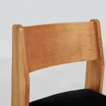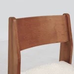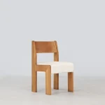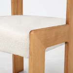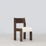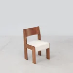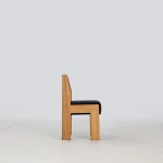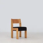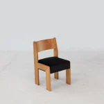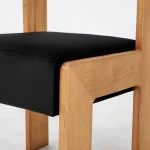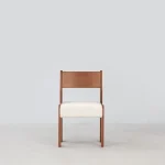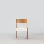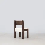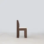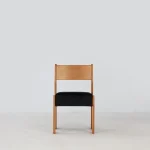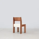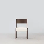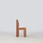 The Reka Side Chair by Sun at Six spotlights contrasting widths. In designing the chair, we played with wide and narrow, thick and thin: the legs are wide and flat along one axis, thin along the other, while the seat cushion was elongated and fattened vertically. We designed this chair for comfortable multi-hour sitting sessions and used a slightly wider footprint and backrest for comfort. The wide panels emphasize the natural grain and luminescent sheen of the makata wood.