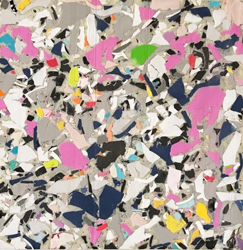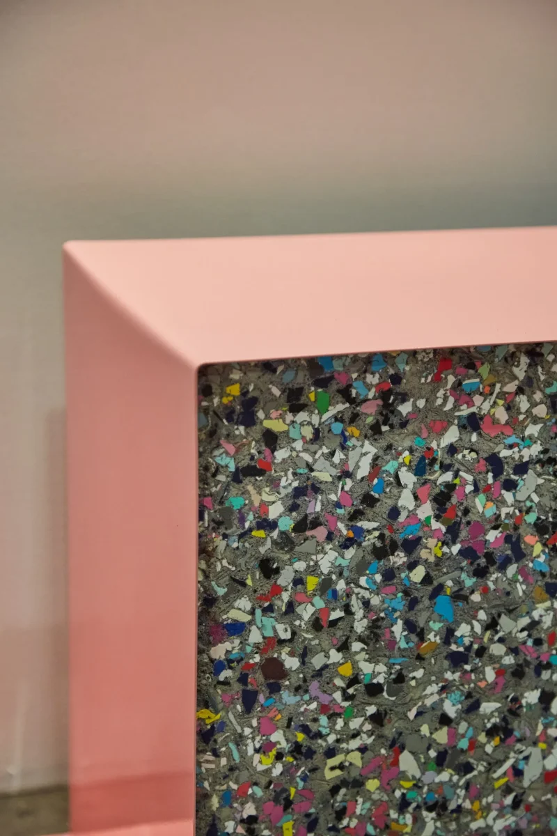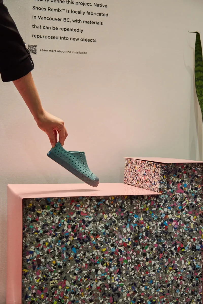 With the intention of creating functional and contemporary designs that replace traditional materials with more environmentally-conscious resources, Flore developed her sculptural structures exclusively using metal and Native Shoes Remix™. Native Shoes Remix™ is a combination of EVA and rubber, the main components of the brand’s line of injection-molded footwear. These primarily mono-material shoes are collected at the end of their useful life, cleaned, and ground, giving them renewed life for new projects and products.