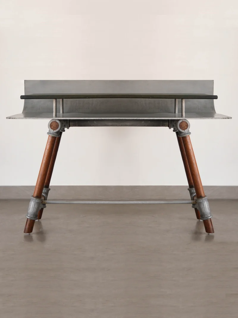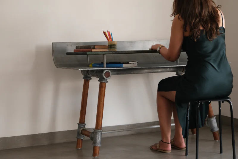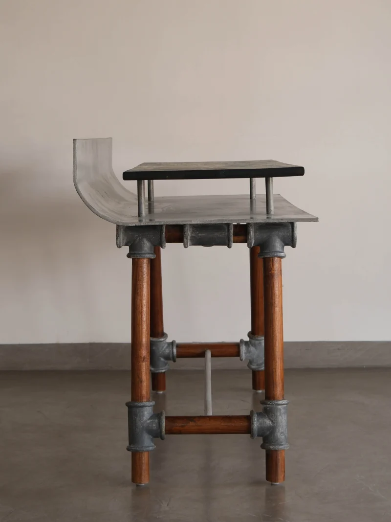 Crafted with precision, the first level features a gracefully curved aluminium sheet, exuding a sense of industrial chic. Above the aluminium sheet rests a luxurious 6-inch Indigo Polished Teak Wood top, adding warmth and depth to the ensemble. Between the two materials there lies a functional gap, perfectly designed to store extra stationery, books, or any other essentials, keeping your space organised and clutter-free.