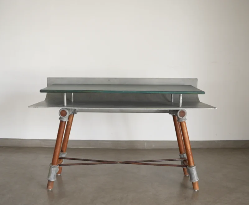 Our contemporary masterpiece, with its seamless blend of materials, thoughtful design, and meticulous craftsmanship, our Curved Aluminium and Indigo Polished Teak Wood Study Table is more than just a piece of furniture; it’s a statement of style.