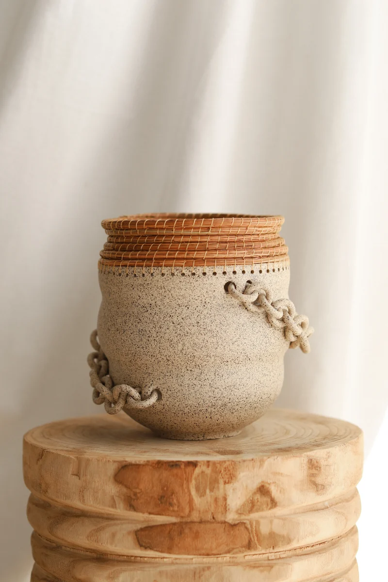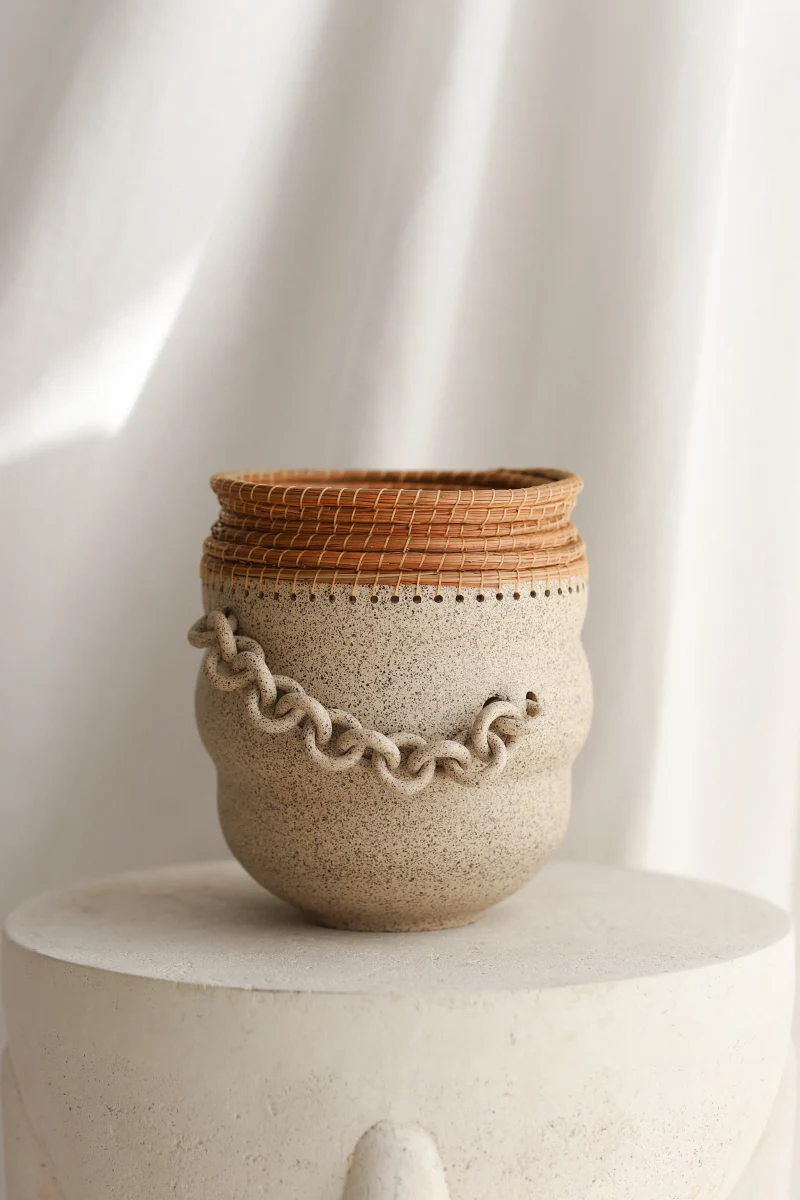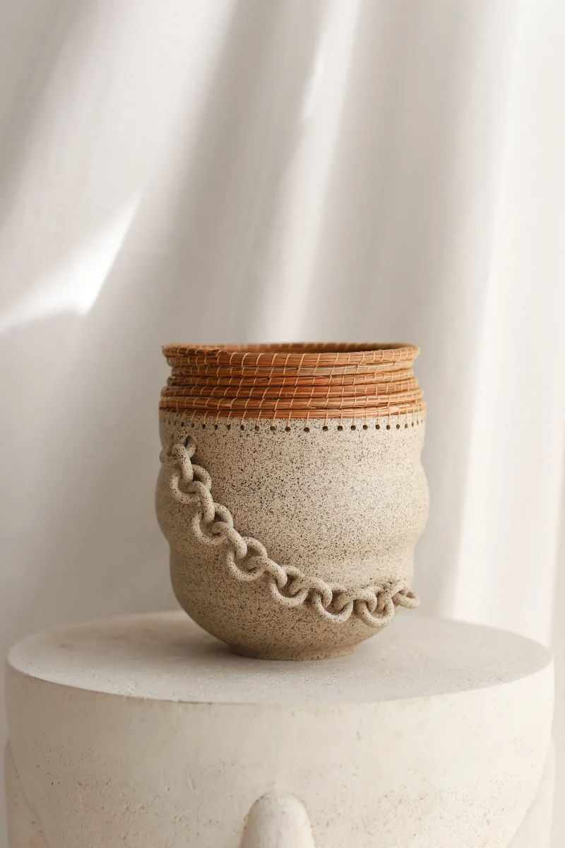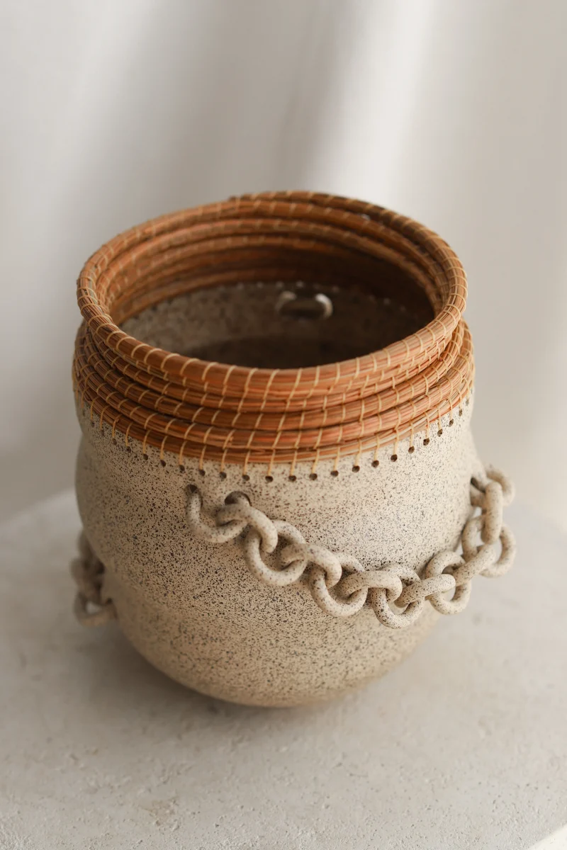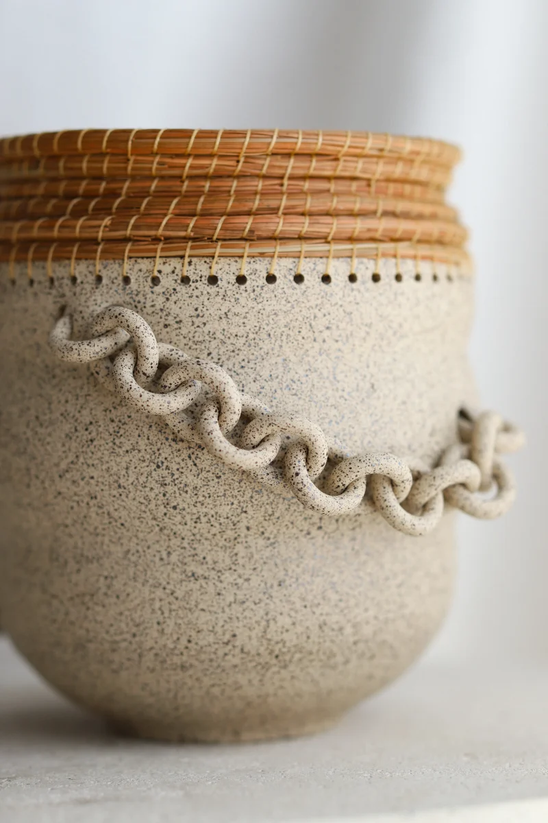 All of her vessels are hand-thrown, the chains and chainmail are hand-sculpted, and the pine needle is woven by hand. While creating, she works with the clay to bring out the organic curves and bends of each piece. She then adorns each piece with chains, chainmail, and/or pine needle. While chains and chainmail usually have a restricting nature, it creates interactive mobility with her pieces. The surface expressions, colors, and textures come together to create a valiantly organic and uniquely spirited form.