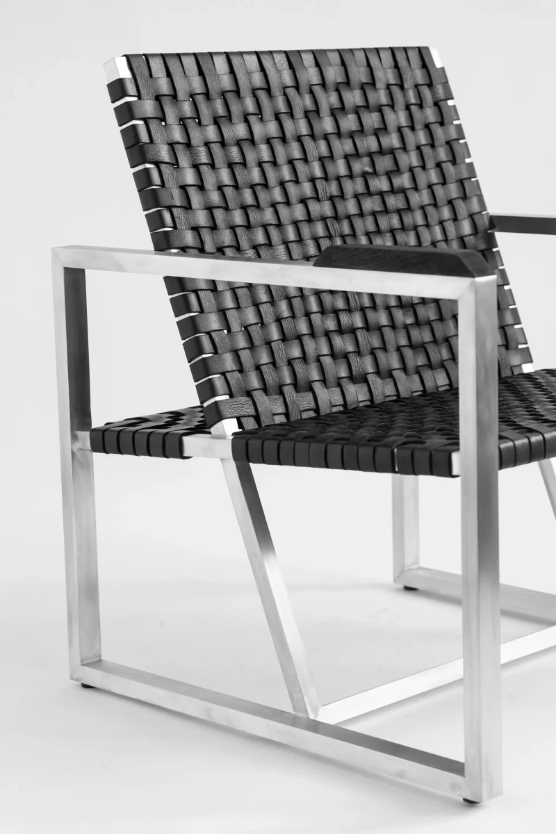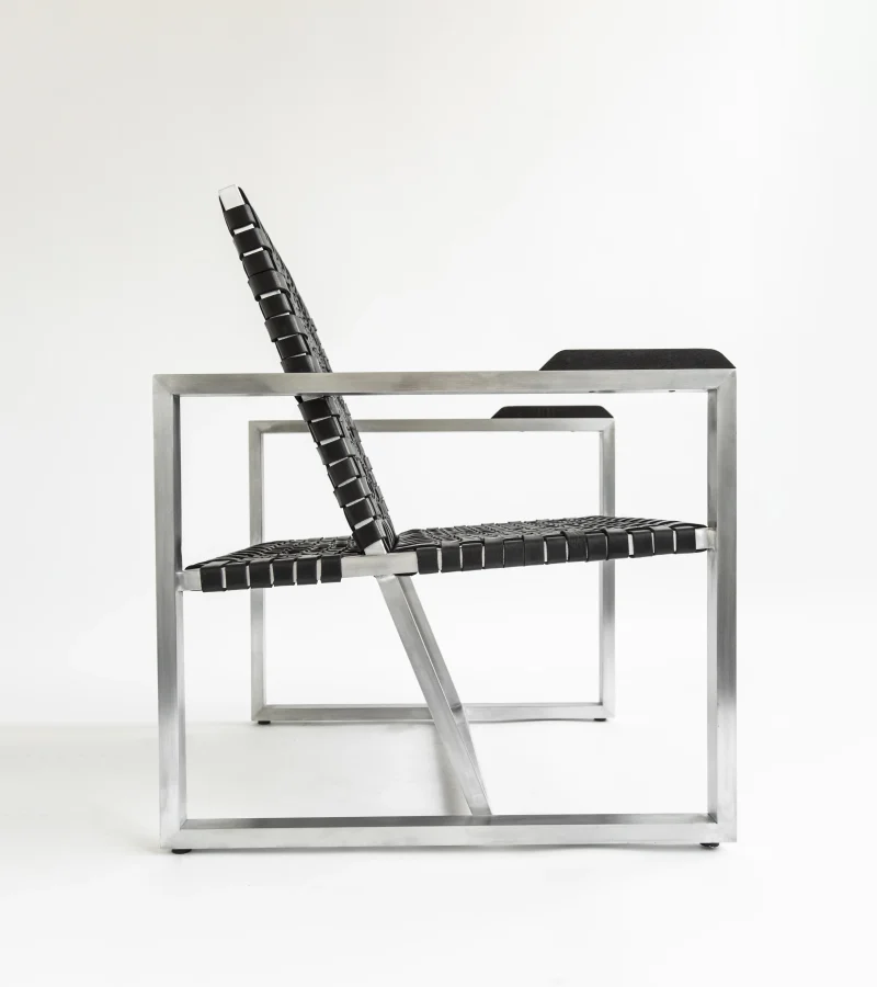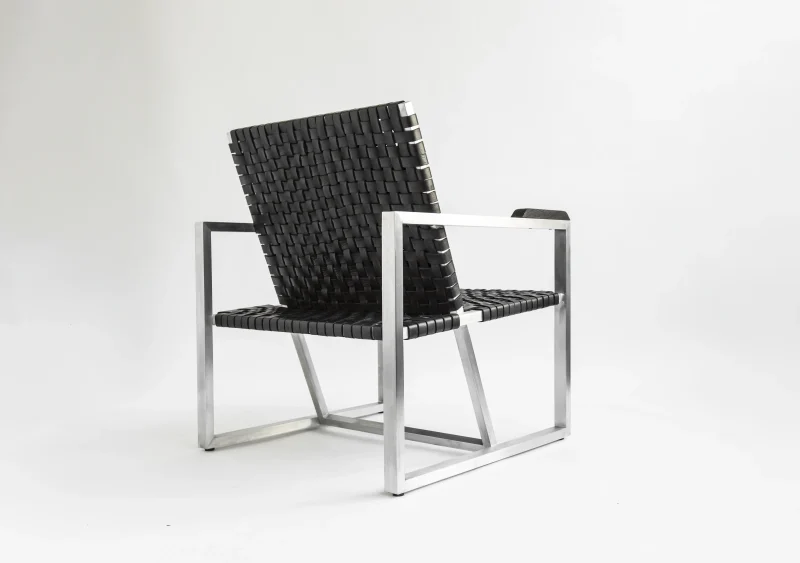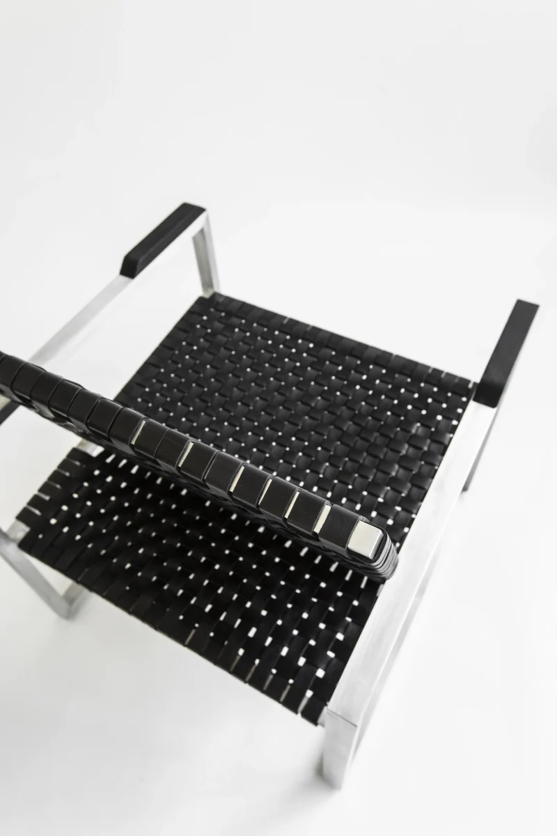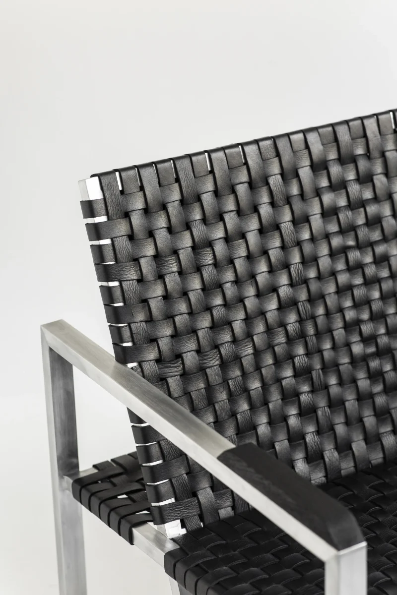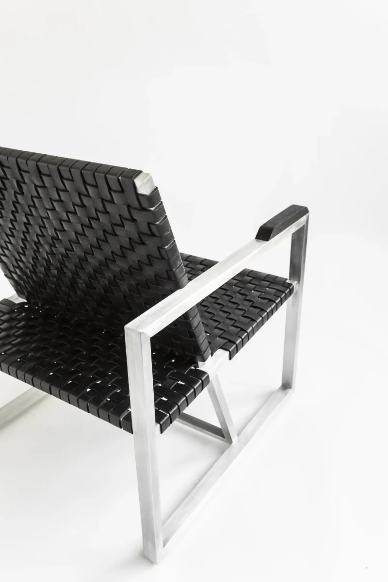 The RIA II Chair is a refined evolution of RIA Design Studio’s flagship piece, RIA I, thoughtfully reimagined for an urban lifestyle. Upon relocating to Brooklyn, New York, RIA’s founder found inspiration in the city’s industrial character and stylish residents. The RIA II’s brushed aluminium frame reflects New York’s rugged yet modern aesthetic, while the black pebbled leather and intricate weaving add texture and elegance. Charred oak handles, crafted using the ancient Japanese Shou Sugi Ban technique, bring an international influence, embodying the Studio’s global perspective.