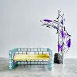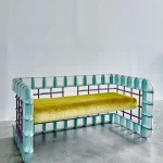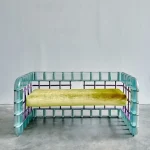 The “Rion Loveseat” captures the essence of Arcana’s 2019 “Altered Common” collection, a whimsical exploration into the miss-use of common building materials, here seen with glass block and wrought iron window guard. Soft and hard, translucent and opaque underscore this Postmodern seating as it absorbs its surroundings.