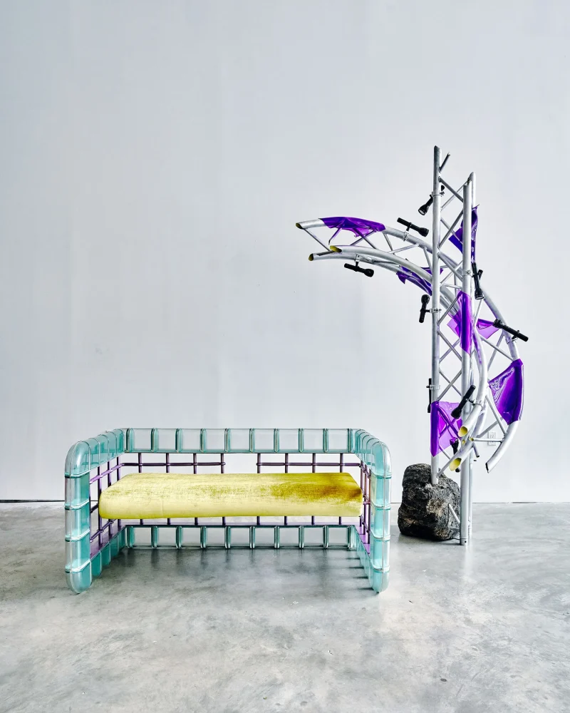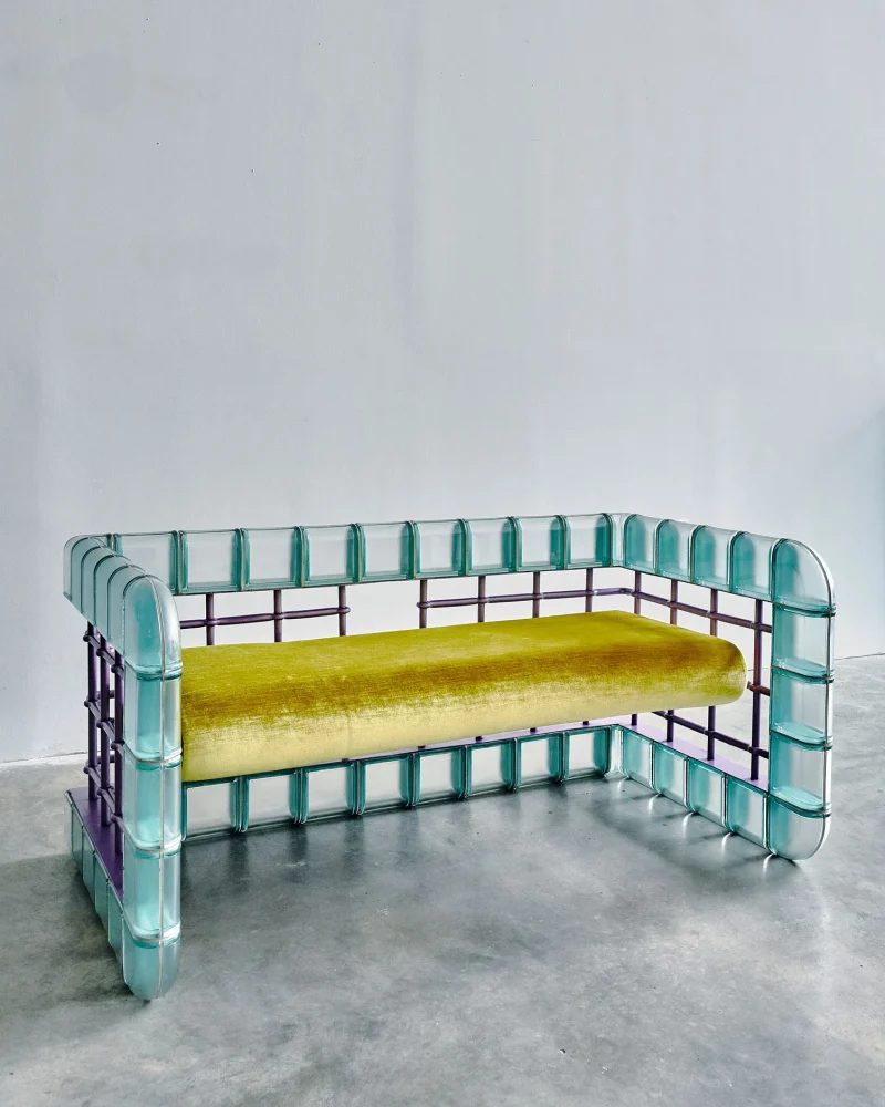 The “Rion Loveseat” captures the essence of Arcana’s 2019 “Altered Common” collection, a whimsical exploration into the miss-use of common building materials, here seen with glass block and wrought iron window guard. Soft and hard, translucent and opaque underscore this Postmodern seating as it absorbs its surroundings.