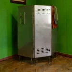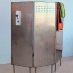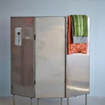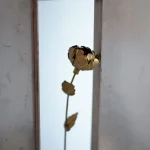 The Riot screen designed by Around the Studio functions as a cover and a hiding place, imitating the visuals of steel shields used by police or the steel walls erected during the Tbilisi protests to deter demonstrators. Its design includes a cut-out window, where a vintage found brass rose—a symbol of revolution deeply ingrained in Georgian collective memory—is placed.