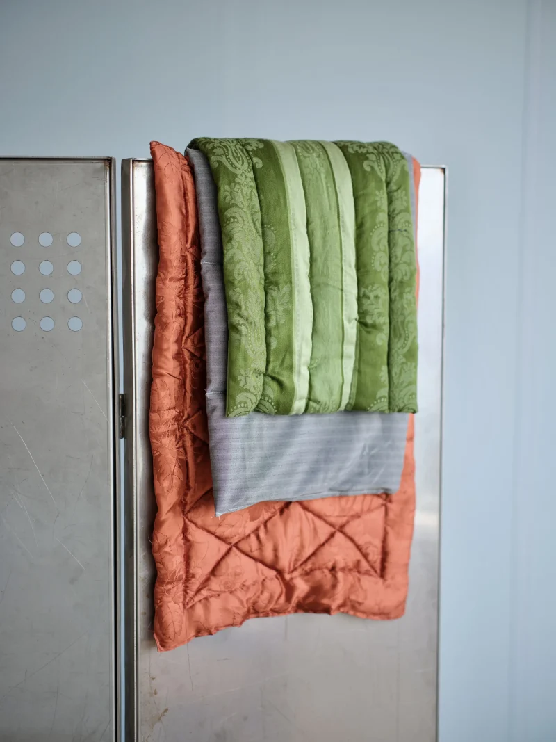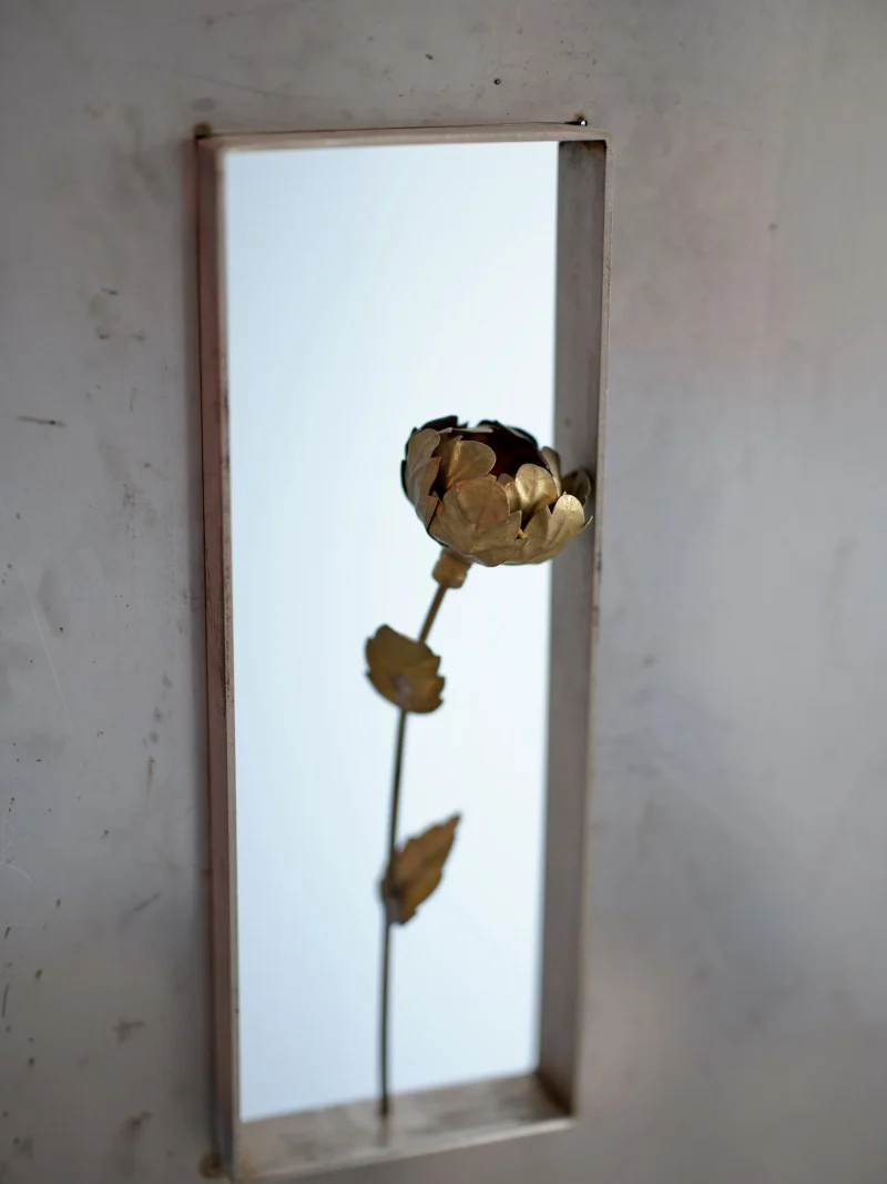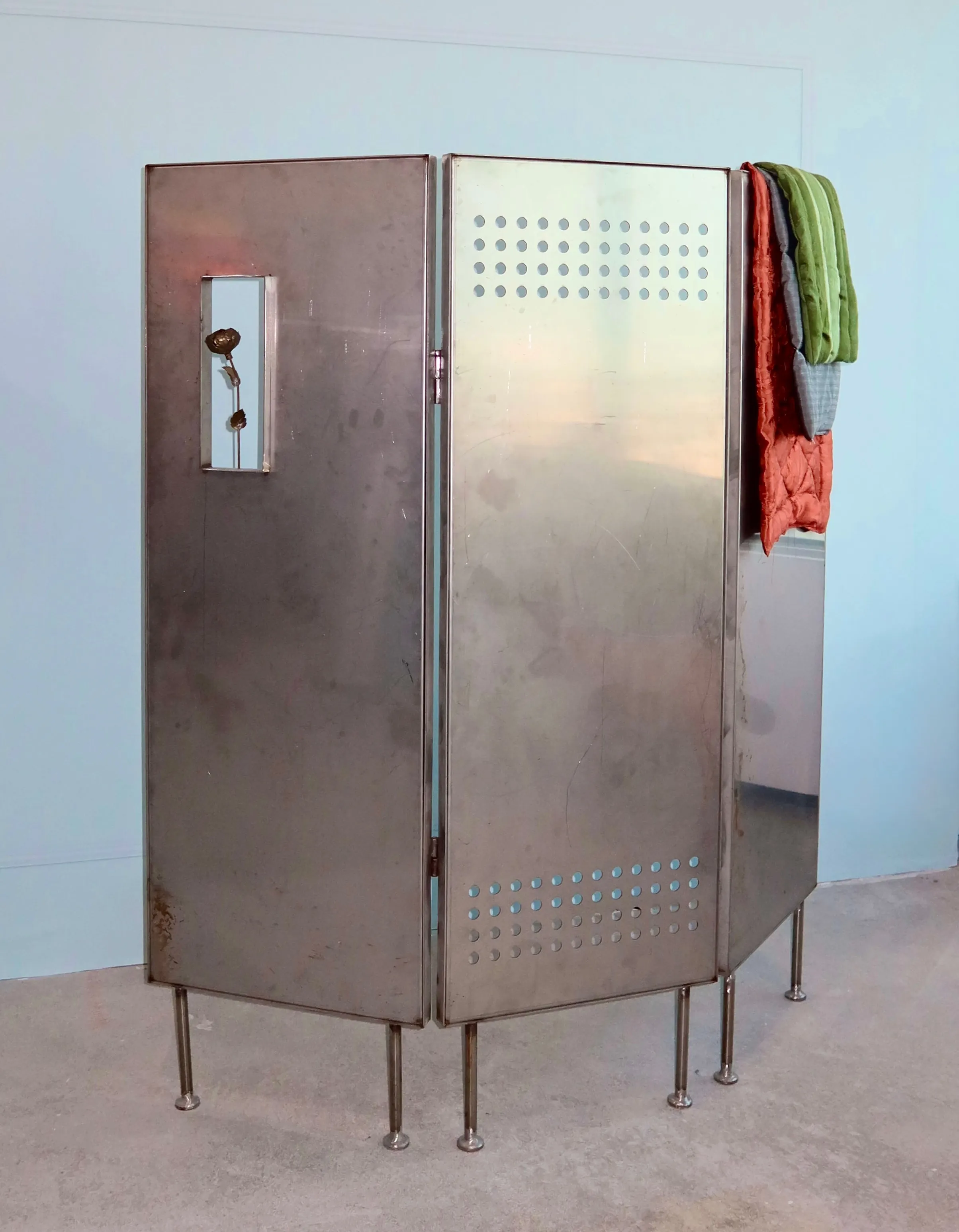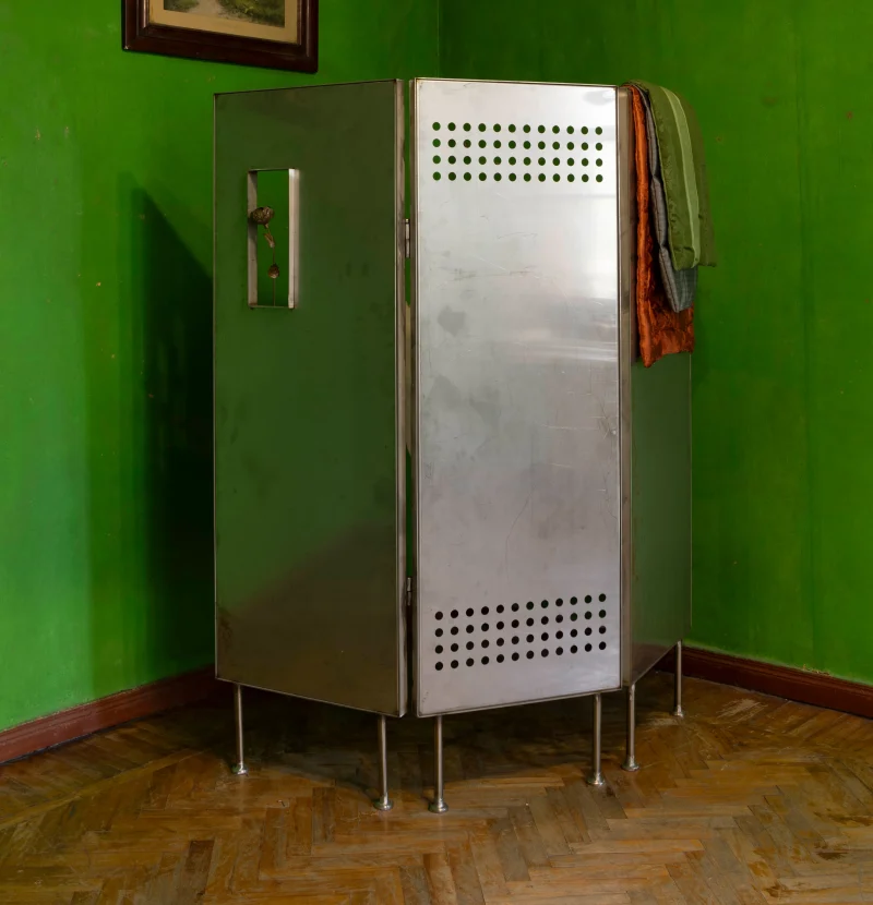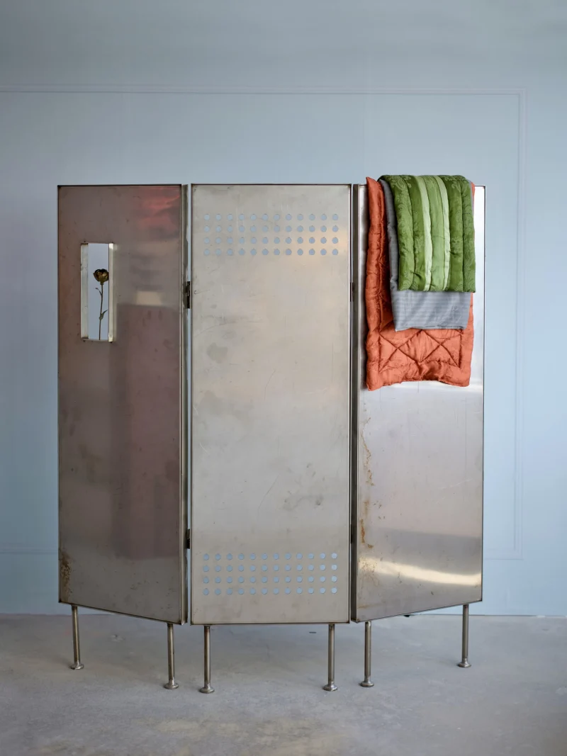 The Riot screen designed by Around the Studio functions as a cover and a hiding place, imitating the visuals of steel shields used by police or the steel walls erected during the Tbilisi protests to deter demonstrators. Its design includes a cut-out window, where a vintage found brass rose—a symbol of revolution deeply ingrained in Georgian collective memory—is placed.