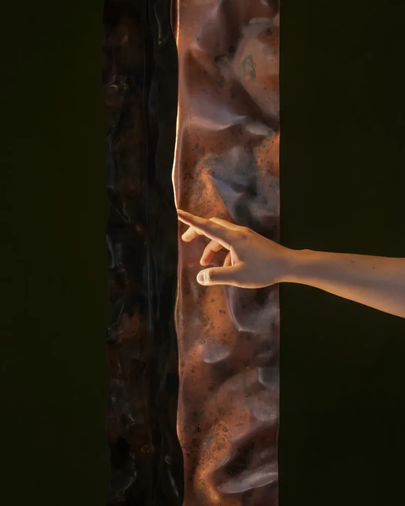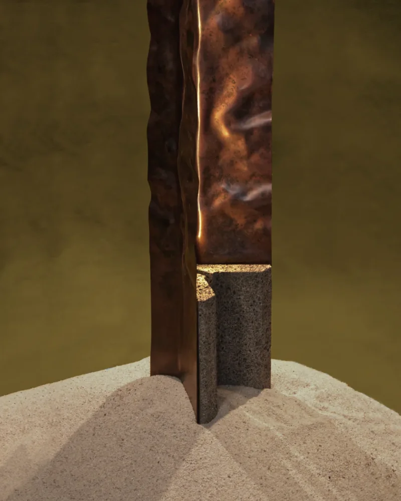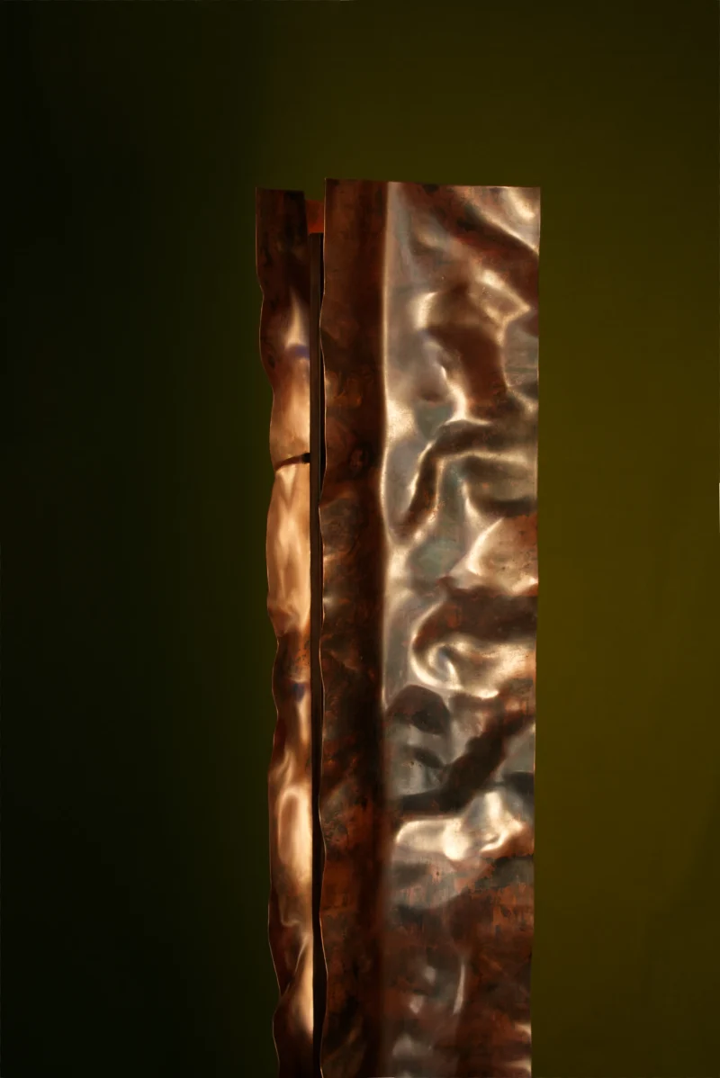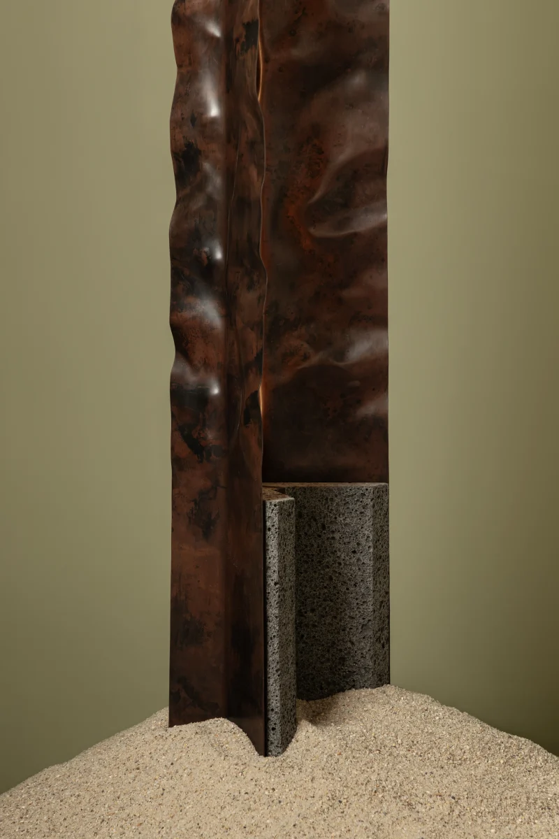 RIVARNO® is an illuminated sculpture inspired by the meeting of the sea and the river. Handcrafted in copper by artisans from Santa Clara del Cobre, Michoacán, and mounted on hand-carved basalt stone, it conveys the subtlety of each wave along its sides and the strength of the earth in its base.