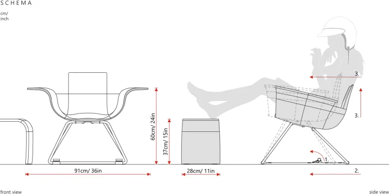 The armchair depth differs from 59-68 cm depending on the chosen inclination angle.