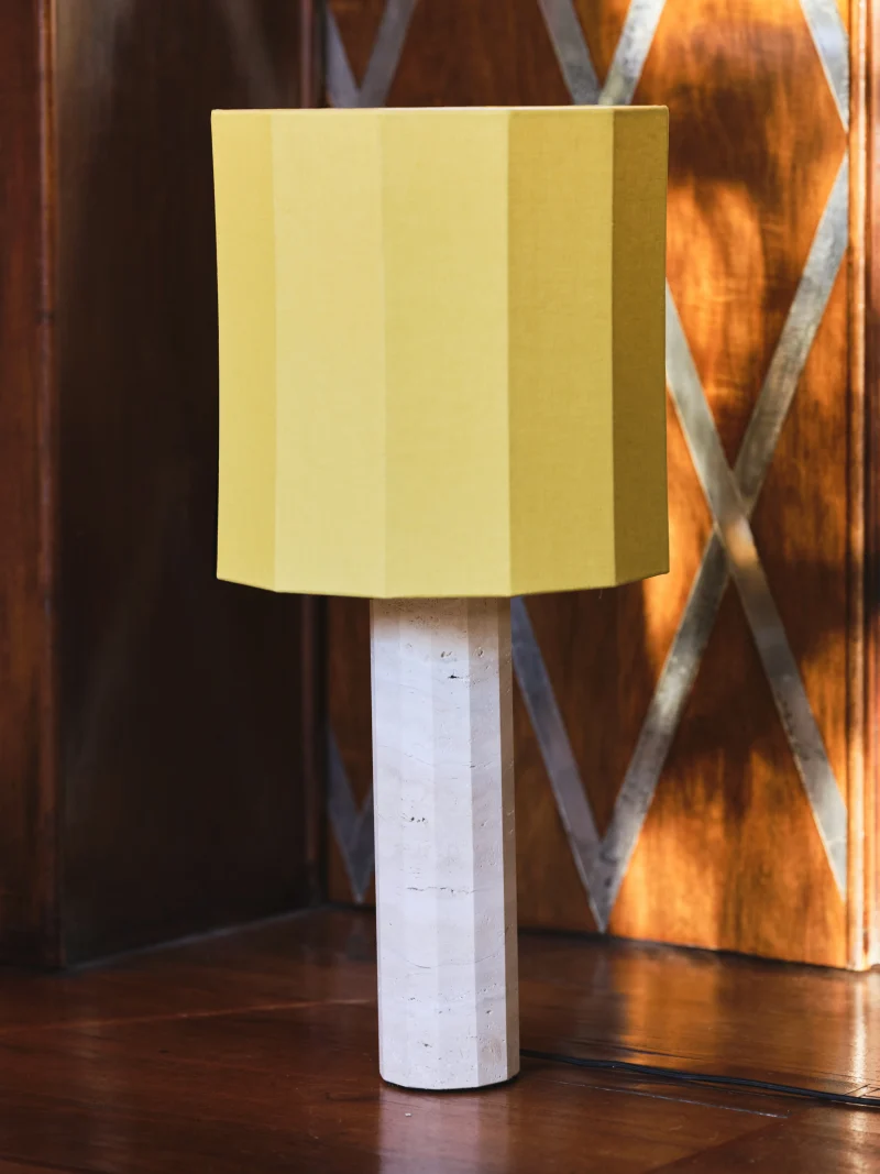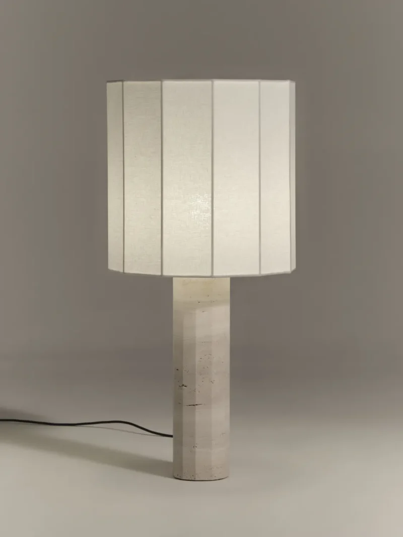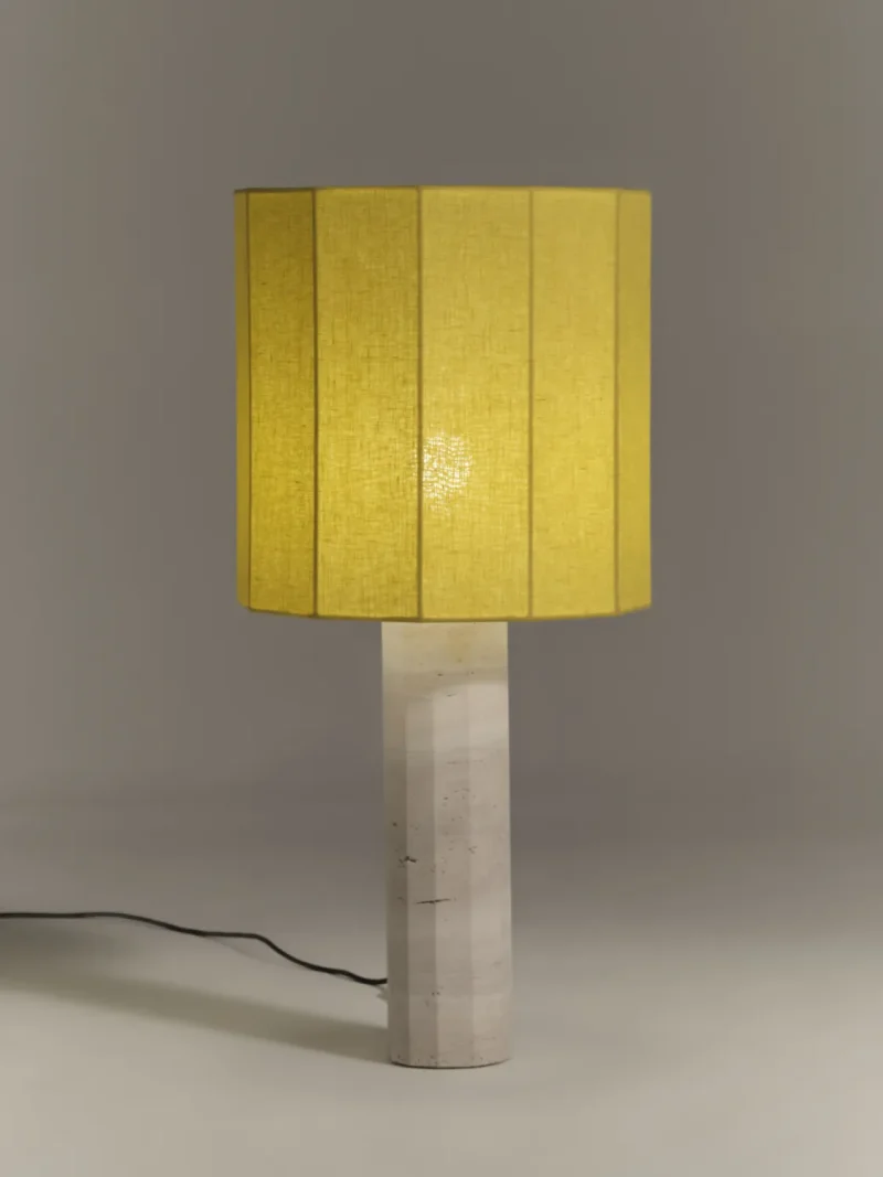 The NASSI LAMPS table lamp features a stunning natural white travertine base paired with sleek nickel-plated brass details, creating a perfect balance of mid-century modern and minimalist design. Its clean-lined aesthetic brings sophistication and style to any room. The hand-sewn, plastic-free lampshade is available in a range of colors, offering customizable options to match your decor. Choose from small, medium, or large sizes to fit your space perfectly. This table lamp is ideal for adding a touch of elegance and modern charm to your home or office