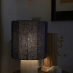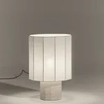 The NASSI LAMPS table lamp features a stunning natural white travertine base paired with sleek nickel-plated brass details, creating a perfect balance of mid-century modern and minimalist design. Its clean-lined aesthetic brings sophistication and style to any room. The hand-sewn, plastic-free lampshade is available in a range of colors, offering customizable options to match your decor. Choose from small, medium, or large sizes to fit your space perfectly. This table lamp is ideal for adding a touch of elegance and modern charm to your home or office