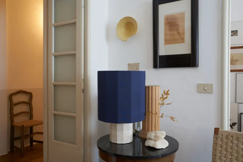 The lamp can be customized to work in any country, the lampshade color can be chosen between the colors of the collection: white, dark blue, lemon yellow, brick red