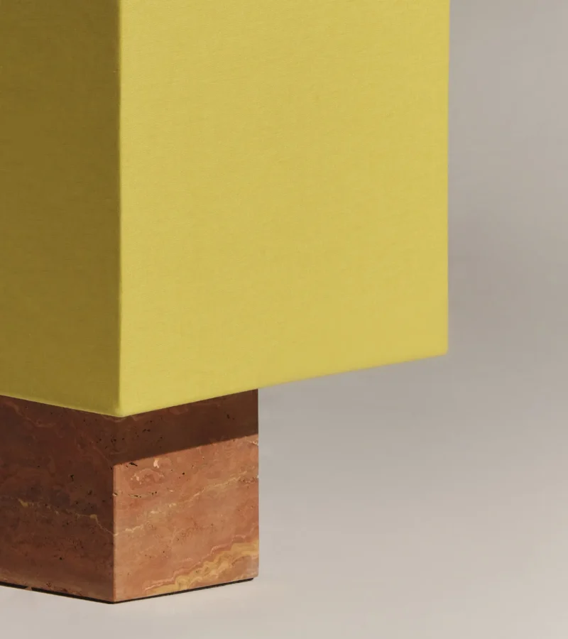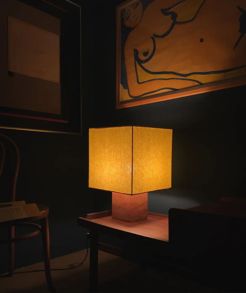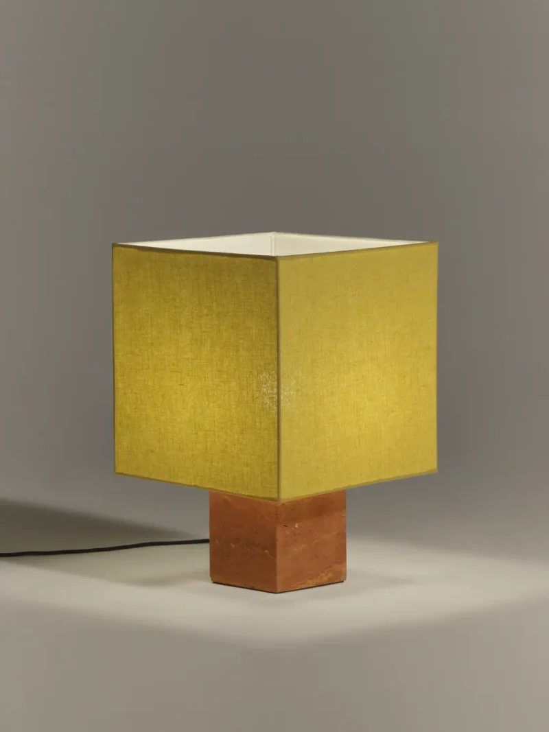 Crafted by NASSI LAMPS, this table lamp showcases a natural red travertine base paired with nickel-plated brass details, delivering a minimalist, modern aesthetic with clean lines. Its plastic-free, hand-sewn lampshade is offered in a range of colors, with the option to include a matching top diffuser for a softly diffused glow. A blend of timeless materials and thoughtful design makes this lamp a stylish and sustainable choice.