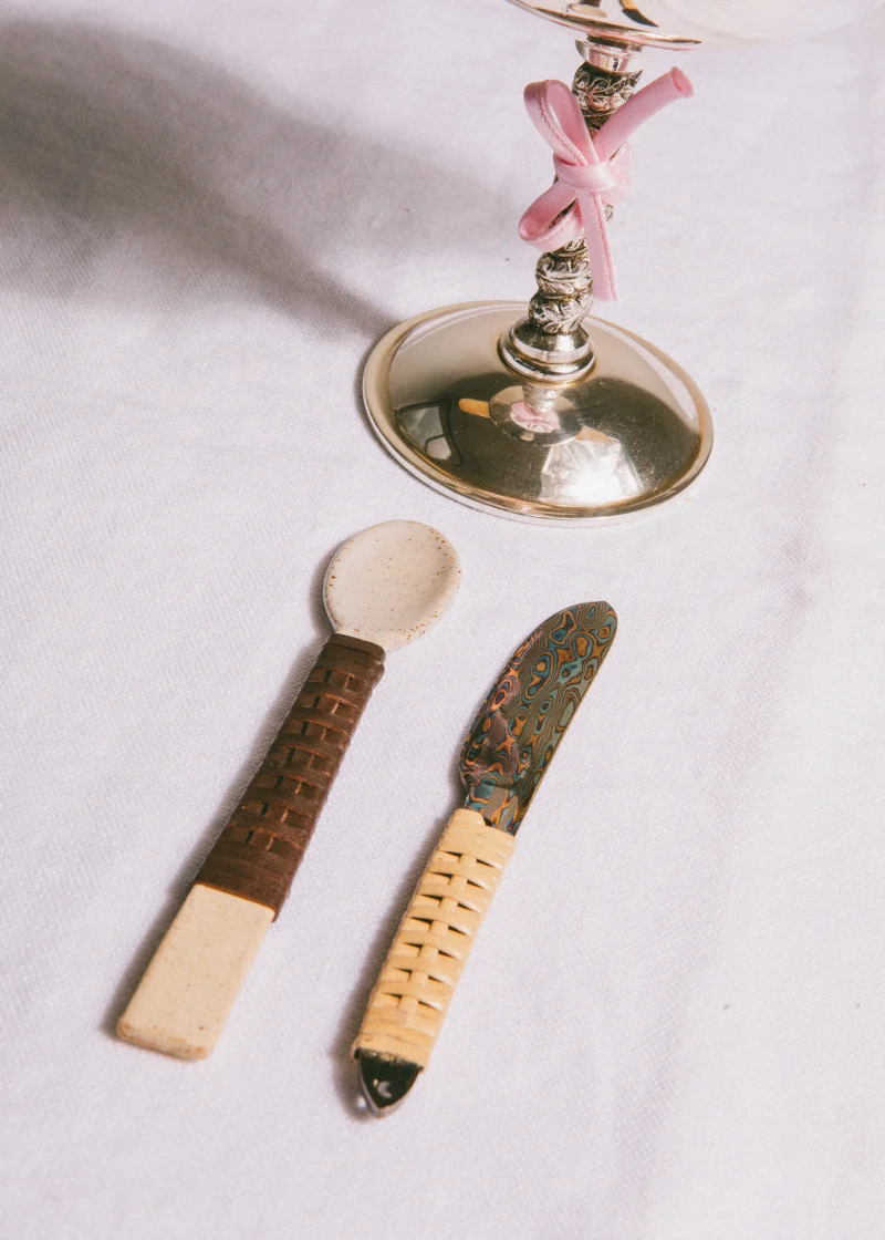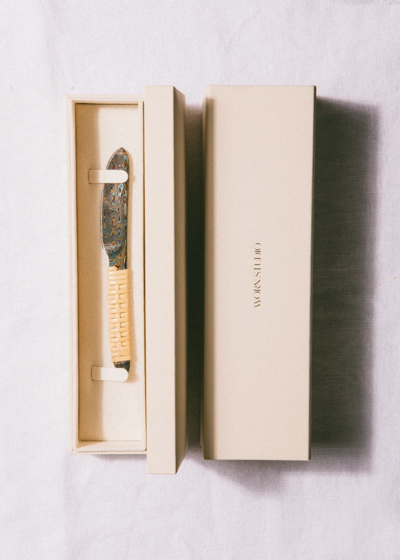 Wicker and damascene steel knife made by two master craftsmen from Spain. This knife is hand crafted by artisans, each piece is made with expert craftsmanship to provide an eclectic and one-of-a-kind look. The high-quality materials ensure that your set will be durable and long-lasting.