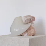 The Rose Quartz Blown Glass Sculpture by Meagan Cignoli Studio is a mesmerizing fusion of nature’s raw beauty and expert craftsmanship. Its design seamlessly integrates the blush-toned translucency of rose quartz with the flowing, organic contours of hand-blown glass, creating a dynamic interplay between strength and fragility.