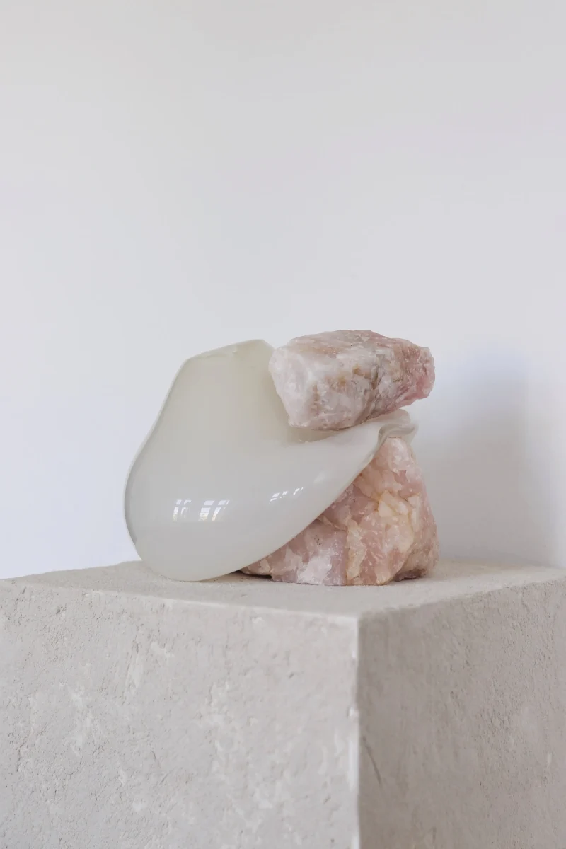 The Rose Quartz Blown Glass Sculpture by Meagan Cignoli Studio is a mesmerizing fusion of nature’s raw beauty and expert craftsmanship. Its design seamlessly integrates the blush-toned translucency of rose quartz with the flowing, organic contours of hand-blown glass, creating a dynamic interplay between strength and fragility.