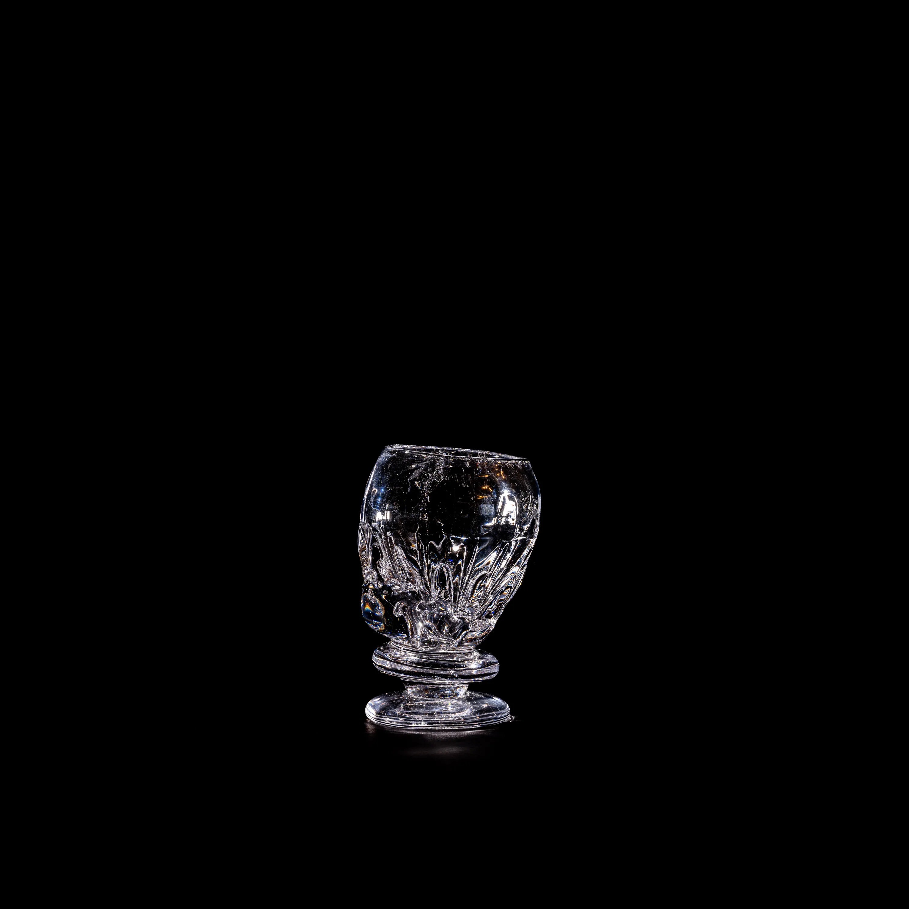 The glass may contain remains of sand, stones and wood used to shape the object due to the experimental process of creation. The glass may contain air bubbles, sharp edges and minor pigment scratches.