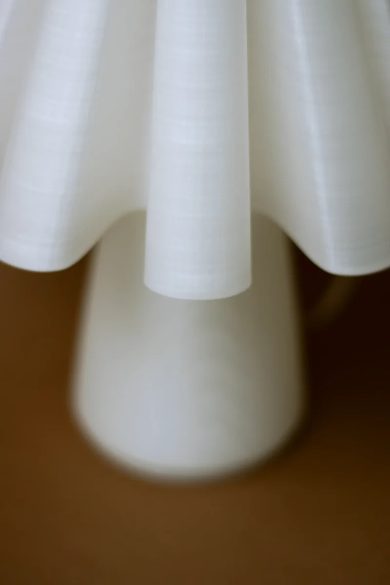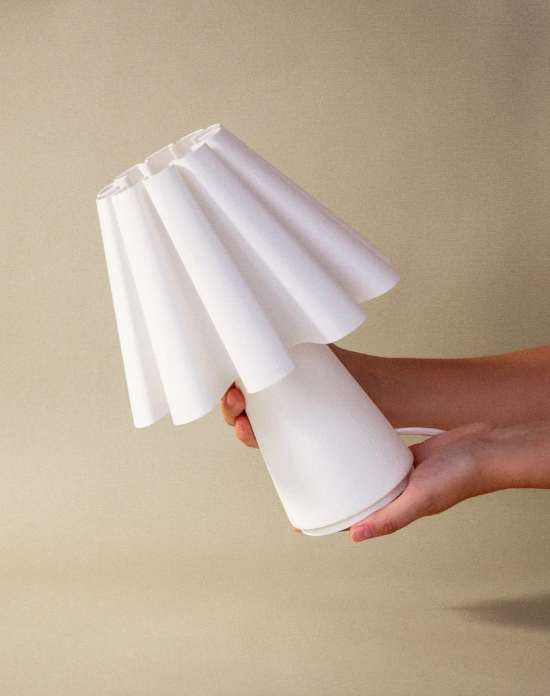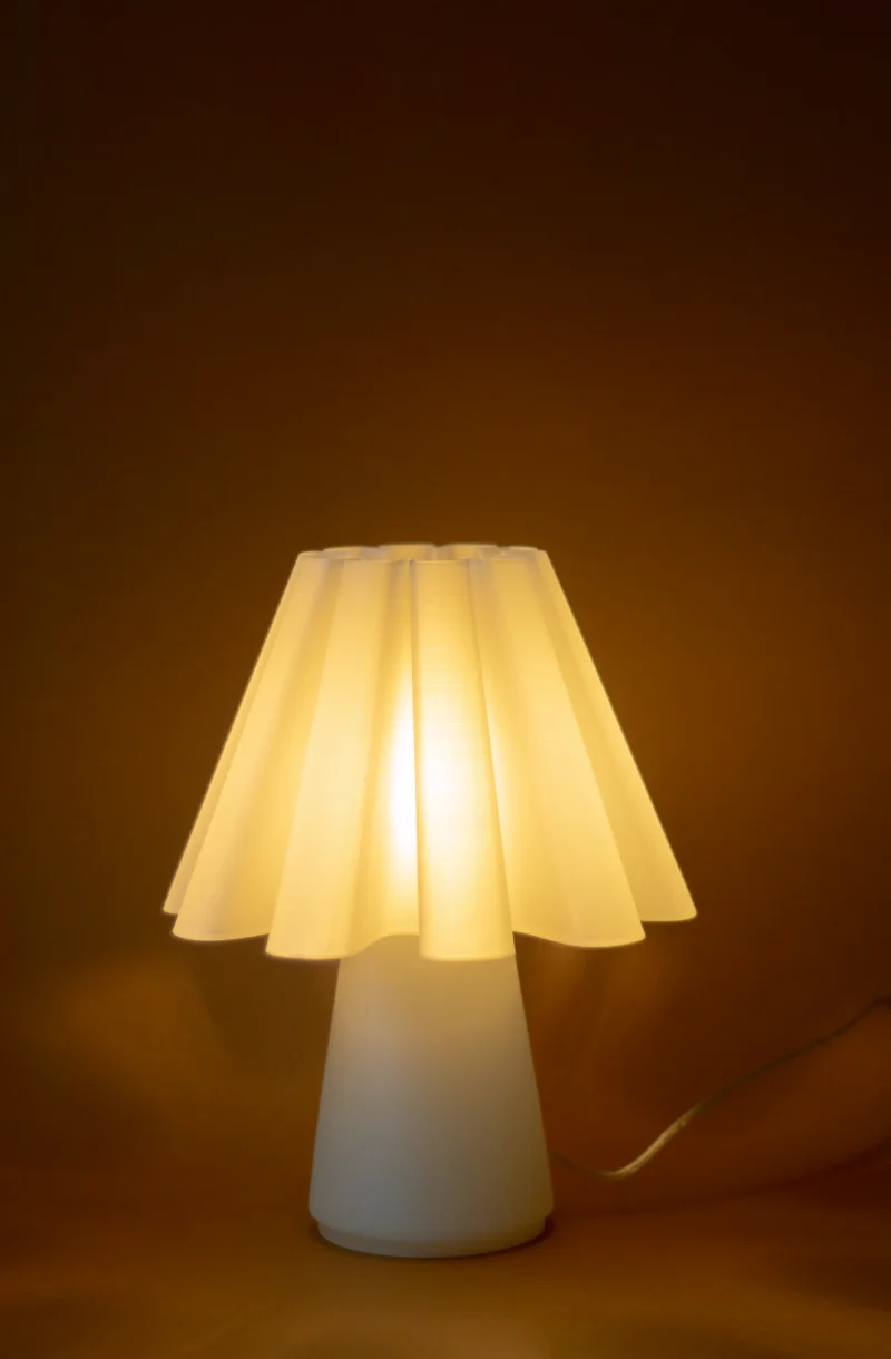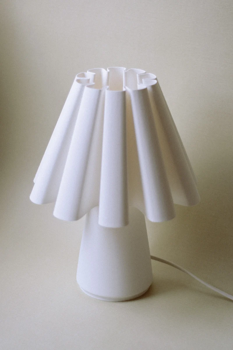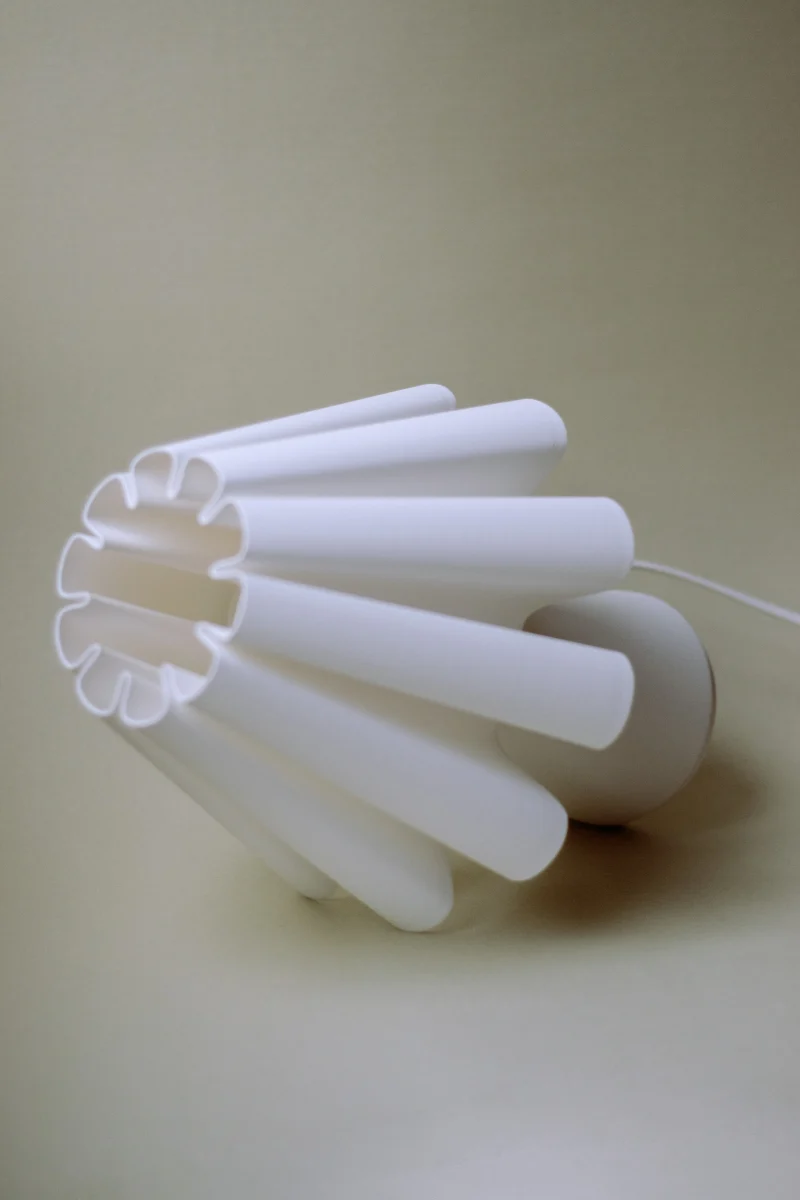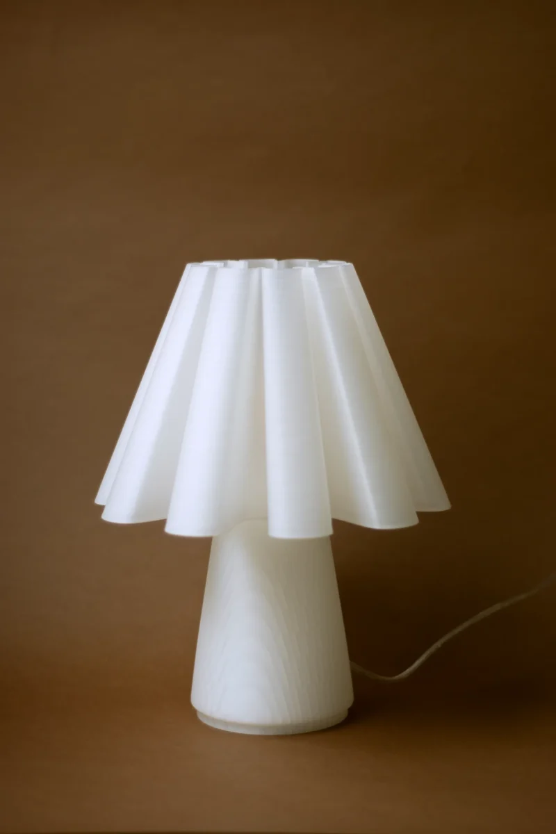 The Ruff Lamp by Mina Wright is fully 3D printed. Printing with 100% recycled PLA produced from corn starch, non-toxic and plant-based, with material imported from the Netherlands.
