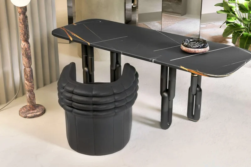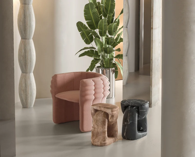 The “Ruffle” Armchair draws its inspiration from the playful and elegant shapes of blouse ruffles. With soft, upholstered contours, the chair captures a sense of movement and fluidity, adding both comfort and charm to any space. The design is whimsical yet refined, bringing a touch of softness and creativity to your living room or lounge area.
