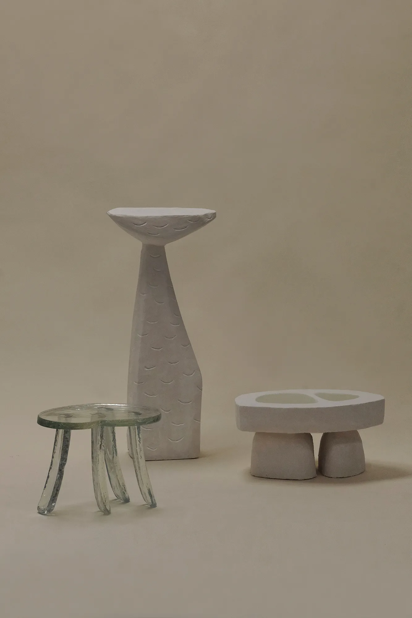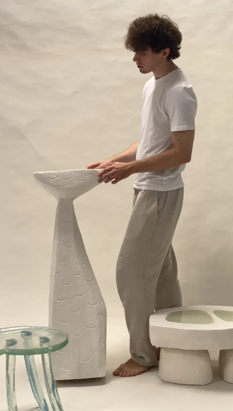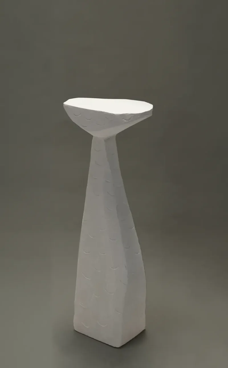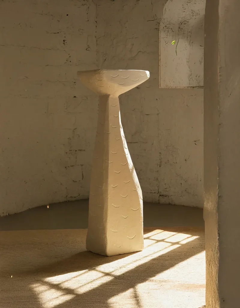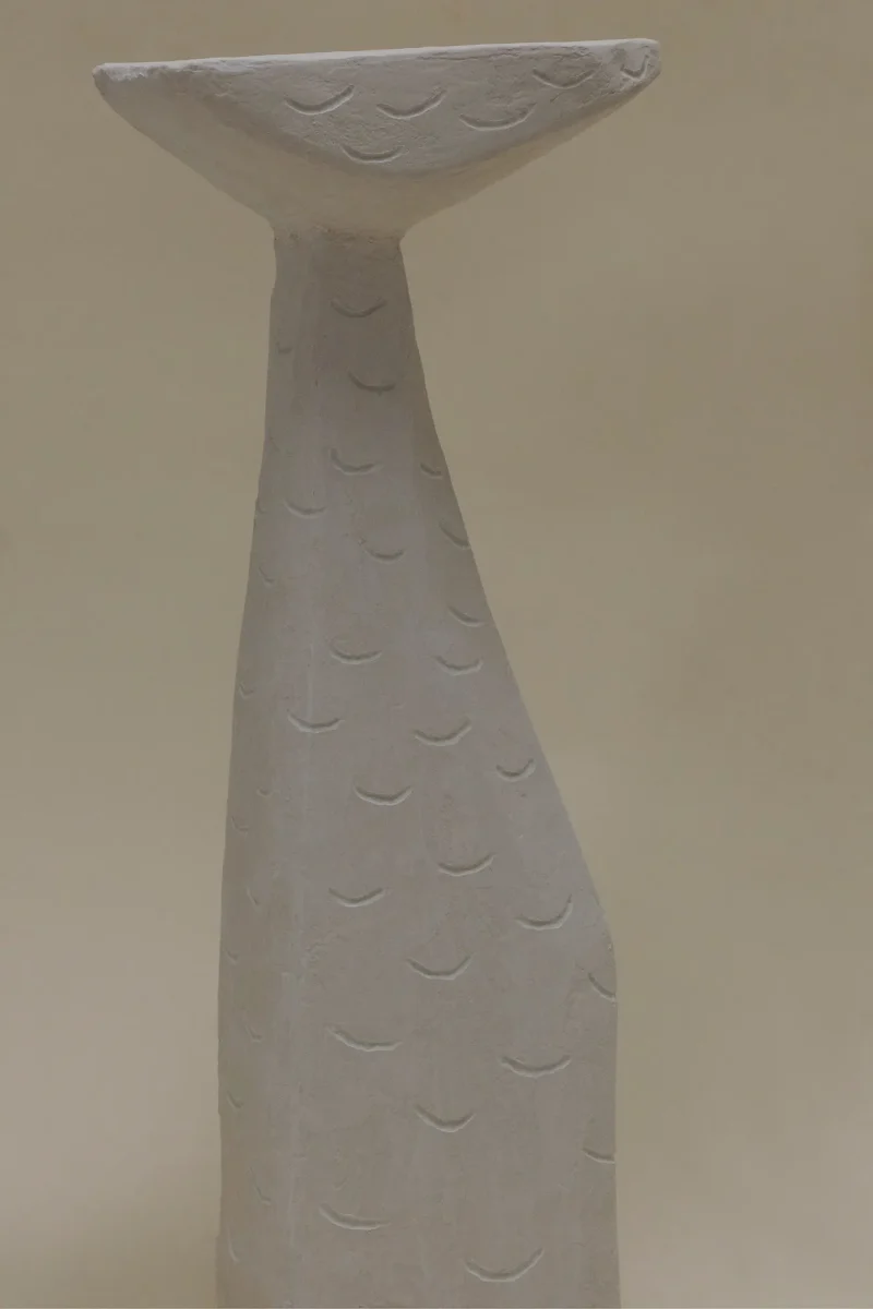 This totem is conceived as both a sculptural object and a functional support or simply as a standalone piece. Inspired by the natural balance of stones stacked one upon another, it is built through a process of layering materials without molds, allowing each form to emerge with its own distinct character. Each totem is unique, a singular balance of textures and shapes, like a stone sculpture reimagined through contemporary materials.